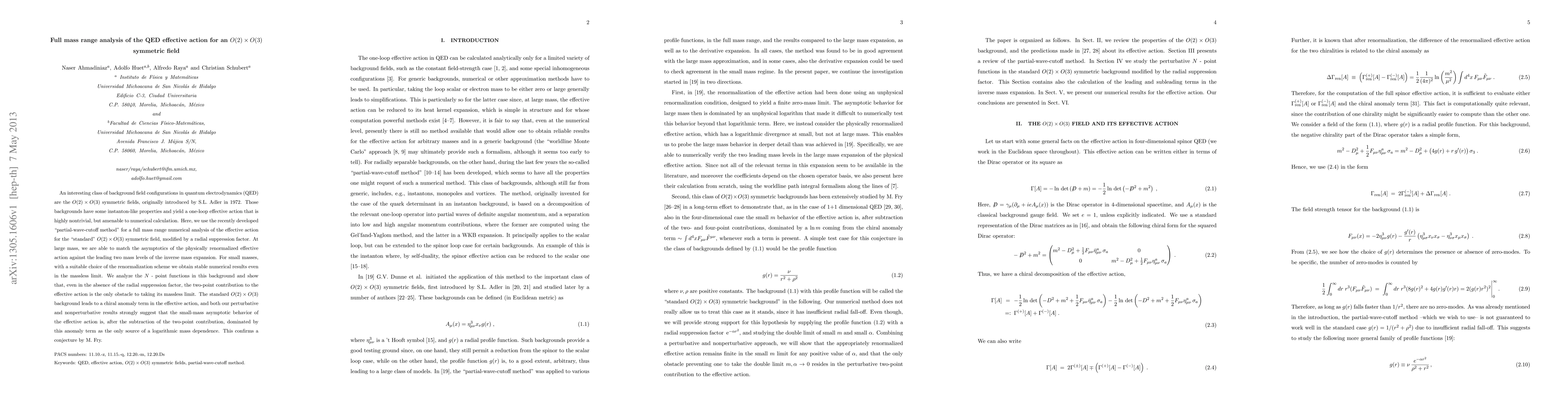 This paper conducts a full mass range numerical analysis of the QED effective action for O(2)xO(3) symmetric fields using the partial-wave-cutoff method, revealing that the chiral anomaly is the dominant term in the small-mass asymptotic behavior, confirming a conjecture by M. Fry.