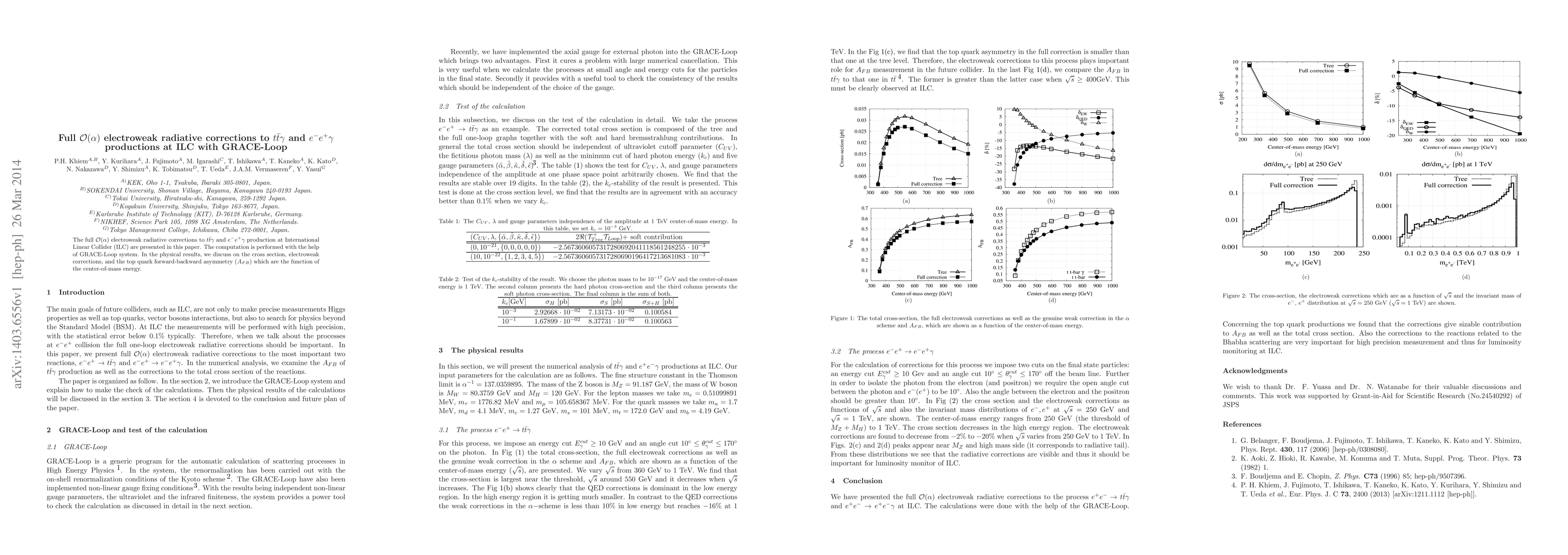 The full $\mathcal{O}(\alpha)$ electroweak radiative corrections to $t \bar{t} \gamma$ and $e^-e^+\gamma$ productions at the International Linear Collider (ILC) are presented in this paper. The computation is performed with the help of GRACE-Loop system. In the physical results, we discuss on the cross section, electroweak corrections, and the top quark forward-backward asymmetry ($A_{FB}$) which are the function of the center-of-mass energy.