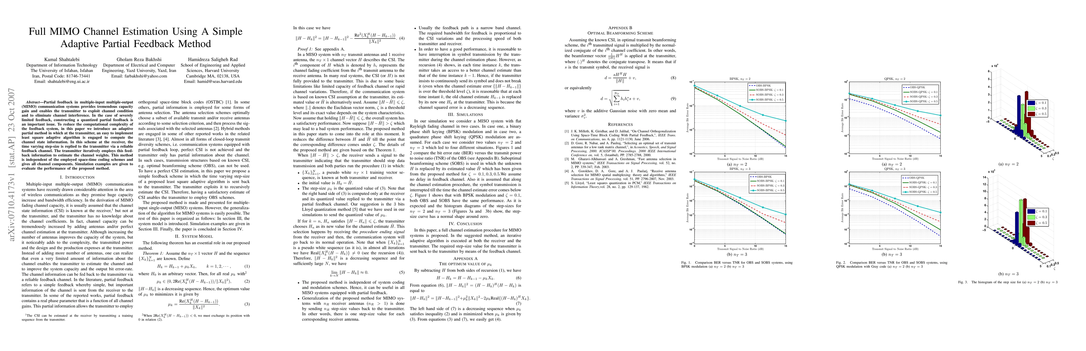 This paper proposes an adaptive partial feedback method for MIMO channel estimation that uses a least square adaptive algorithm to compute channel state information, reducing computational complexity. The method iteratively refines channel weight estimates using time-varying step-size feedback, demonstrating performance through simulation examples.