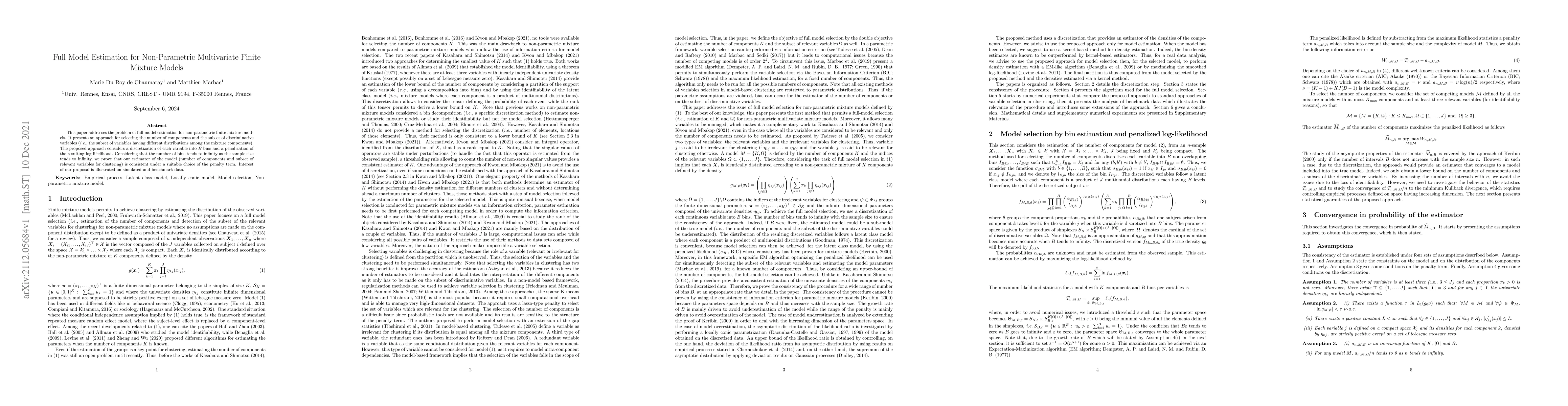 This paper addresses the problem of full model estimation for non-parametric finite mixture models. It presents an approach for selecting the number of components and the subset of discriminative variables (i.e., the subset of variables having different distributions among the mixture components). The proposed approach considers a discretization of each variable into B bins and a penalization of the resulting log-likelihood. Considering that the number of bins tends to infinity as the sample size tends to infinity, we prove that our estimator of the model (number of components and subset of relevant variables for clustering) is consistent under a suitable choice of the penalty term. Interest of our proposal is illustrated on simulated and benchmark data.