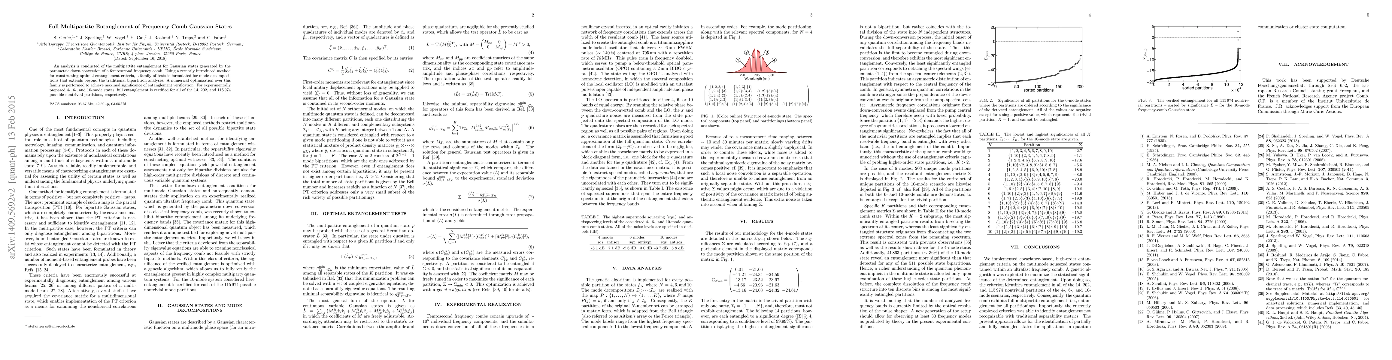 This paper certifies full multipartite entanglement in Gaussian states generated by parametric down-conversion of a femtosecond frequency comb. Using advanced entanglement criteria, it verifies entanglement for all nontrivial partitions in 4-, 6-, and 10-mode states.