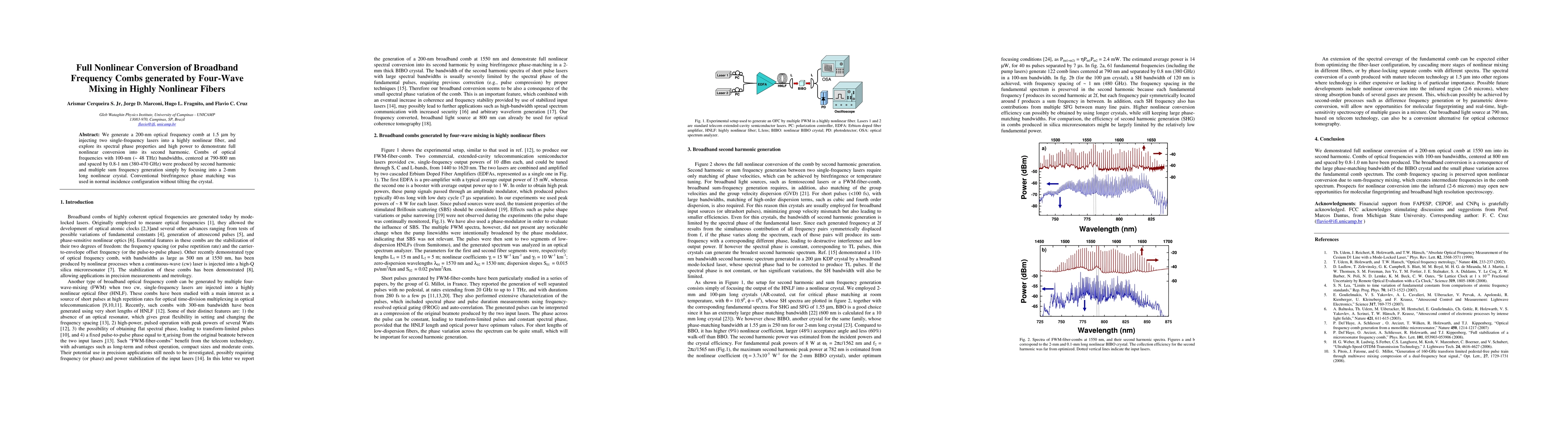 This paper details the generation of a broadband optical frequency comb via four-wave mixing in highly nonlinear fibers, and explores its spectral phase properties and successful full nonlinear conversion into its second harmonic. The comb, with a 200-nm bandwidth, is produced by injecting two single-frequency lasers and demonstrates high power through second harmonic generation in a 2-mm nonlinear crystal.