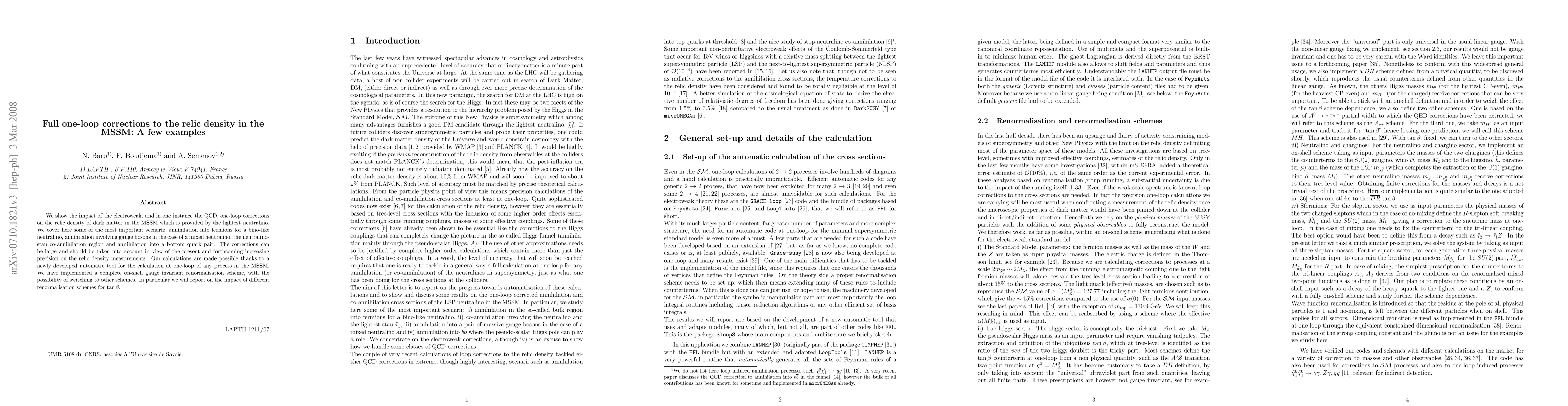 We show the impact of the electroweak, and in one instance the QCD, one-loop corrections on the relic density of dark matter in the MSSM which is provided by the lightest neutralino. We cover here some of the most important scenarii: annihilation into fermions for a bino-like neutralino, annihilation involving gauge bosons in the case of a mixed neutralino, the neutralino-stau co-annihilation region and annihilation into a bottom quark pair. The corrections can be large and should be taken into account in view of the present and forthcoming increasing precision on the relic density measurements. Our calculations are made possible thanks to a newly developed automatic tool for the calculation at one-loop of any process in the MSSM. We have implemented a complete on-shell gauge invariant renormalisation scheme, with the possibility of switching to other schemes. In particular we will report on the impact of different renormalisation schemes for tan beta.