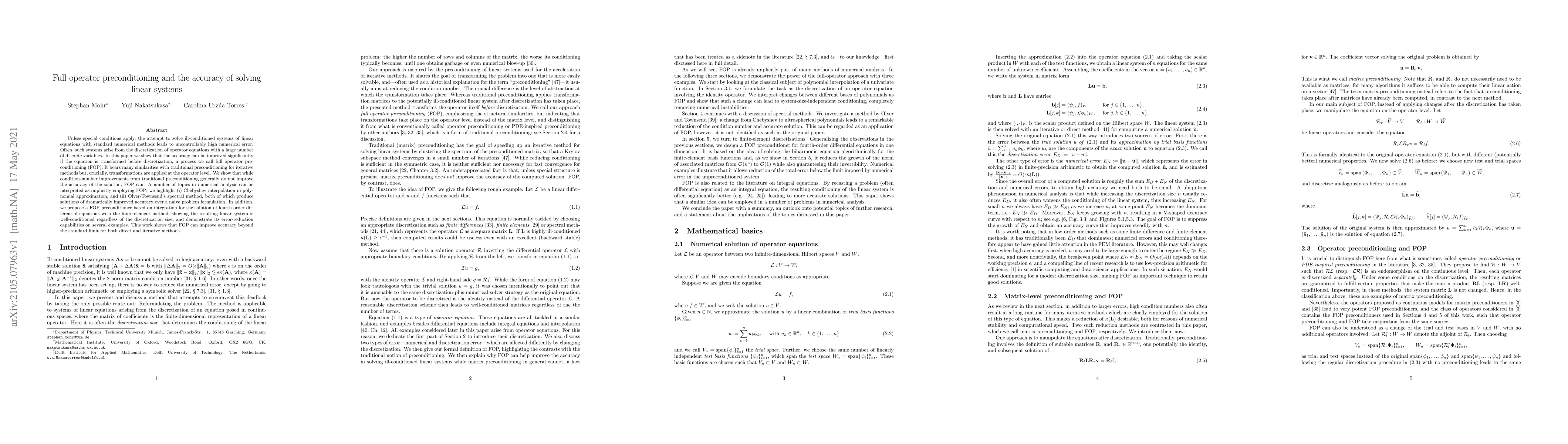 Unless special conditions apply, the attempt to solve ill-conditioned systems of linear equations with standard numerical methods leads to uncontrollably high numerical error. Often, such systems arise from the discretization of operator equations with a large number of discrete variables. In this paper we show that the accuracy can be improved significantly if the equation is transformed before discretization, a process we call full operator preconditioning (FOP). It bears many similarities with traditional preconditioning for iterative methods but, crucially, transformations are applied at the operator level. We show that while condition-number improvements from traditional preconditioning generally do not improve the accuracy of the solution, FOP can. A number of topics in numerical analysis can be interpreted as implicitly employing FOP; we highlight (i) Chebyshev interpolation in polynomial approximation, and (ii) Olver-Townsend's spectral method, both of which produce solutions of dramatically improved accuracy over a naive problem formulation. In addition, we propose a FOP preconditioner based on integration for the solution of fourth-order differential equations with the finite-element method, showing the resulting linear system is well-conditioned regardless of the discretization size, and demonstrate its error-reduction capabilities on several examples. This work shows that FOP can improve accuracy beyond the standard limit for both direct and iterative methods.