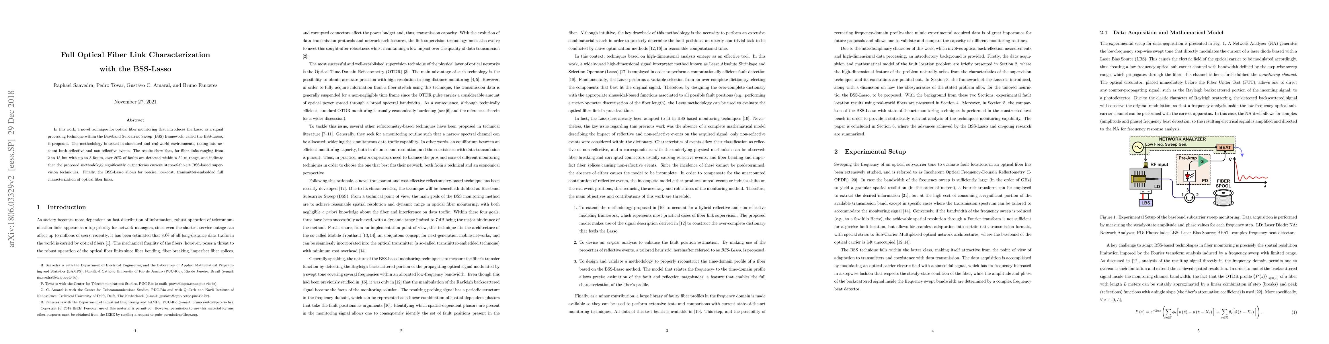 The BSS-Lasso technique leverages frequency-swept optical sub-carriers and Lasso signal processing to efficiently localize faults in optical fiber links, achieving over 80% detection accuracy within 50 meters for links up to 15 km, outperforming existing methods. This method enables precise, low-cost, full characterization of fiber links.