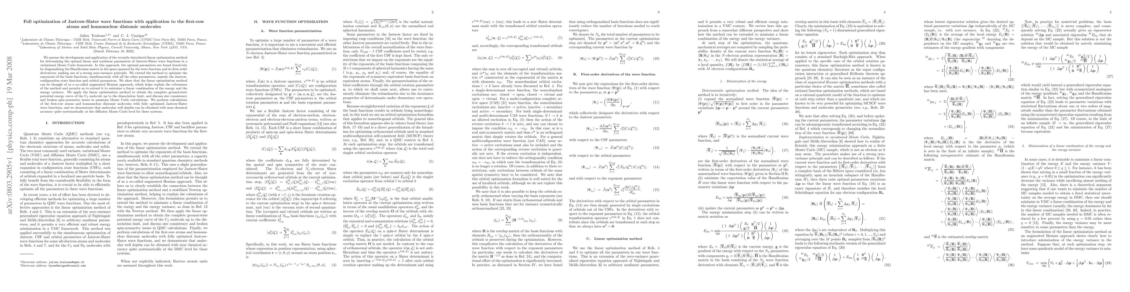 This paper develops a linear optimization method for determining optimal parameters in Jastrow-Slater wave functions within a variational Monte Carlo framework, achieving near chemical accuracy for first-row atoms and homonuclear diatomic molecules, and demonstrating robustness through an augmented Hessian approach. The method optimizes both linear and nonlinear parameters, including basis function exponents, and is applied to obtain the ground-state potential energy curve for C_2.