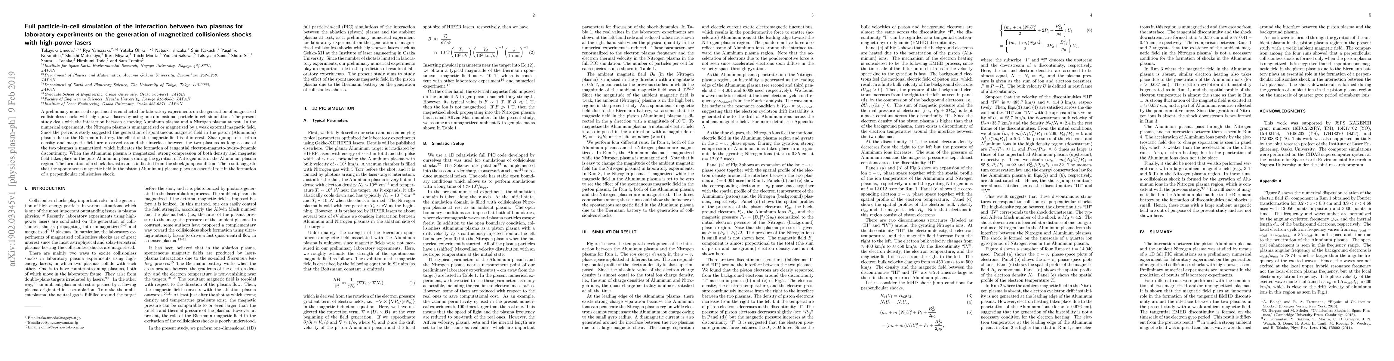 A preliminary numerical experiment is conducted for laboratory experiments on the generation of magnetized collisionless shocks with high-power lasers by using one-dimensional particle-in-cell simulation. The present study deals with the interaction between a moving Aluminum plasma and a Nitrogen plasma at rest. In the numerical experiment, the Nitrogen plasma is unmagnetized or magnetized by a weak external magnetic field. Since the previous study suggested the generation of spontaneous magnetic field in the piston (Aluminum) plasma due to the Biermann battery, the effect of the magnetic field is of interest. Sharp jumps of electron density and magnetic field are observed around the interface between the two plasmas as long as one of the two plasmas is magnetized, which indicates the formation of tangential electron-magneto-hydro-dynamic discontinuity. When the Aluminum plasma is magnetized, strong compression of both density and magnetic field takes place in the pure Aluminum plasma during the gyration of Nitrogen ions in the Aluminum plasma region. The formation of a shock downstream is indicated from the shock jump condition. The result suggests that the spontaneous magnetic field in the piston (Aluminum) plasma plays an essential role in the formation of a perpendicular collisionless shock.