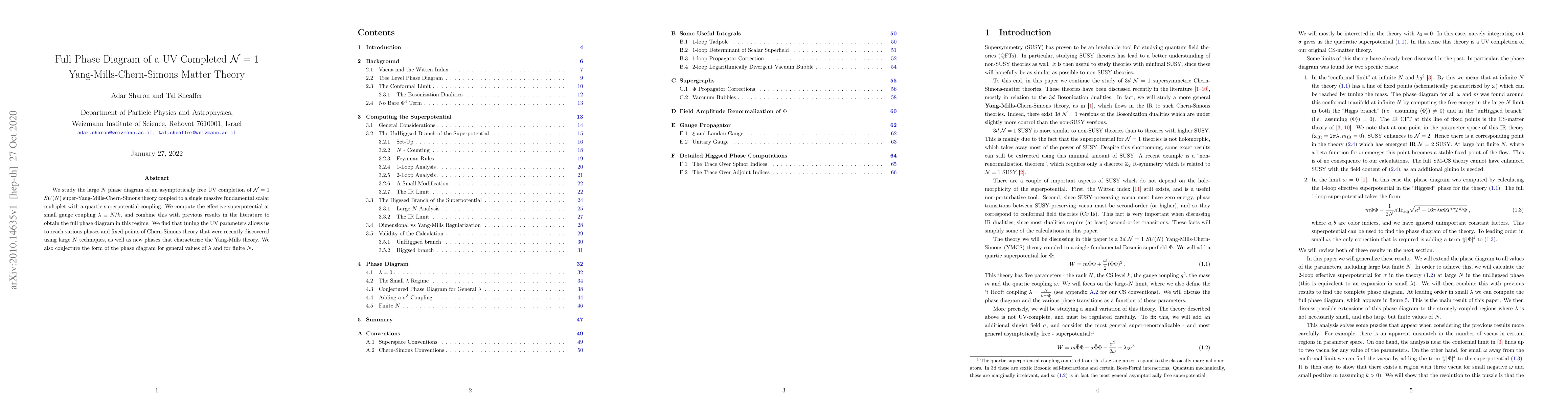 We study the large $N$ phase diagram of an asymptotically free UV completion of $\mathcal{N}=1$ $SU(N)$ super-Yang-Mills-Chern-Simons theory coupled to a single massive fundamental scalar multiplet with a quartic superpotential coupling. We compute the effective superpotential at small gauge coupling $\lambda\equiv N/k$, and combine this with previous results in the literature to obtain the full phase diagram in this regime. We find that tuning the UV parameters allows us to reach various phases and fixed points of Chern-Simons theory that were recently discovered using large $N$ techniques, as well as new phases that characterize the Yang-Mills theory. We also conjecture the form of the phase diagram for general values of $\lambda$ and for finite $N$.