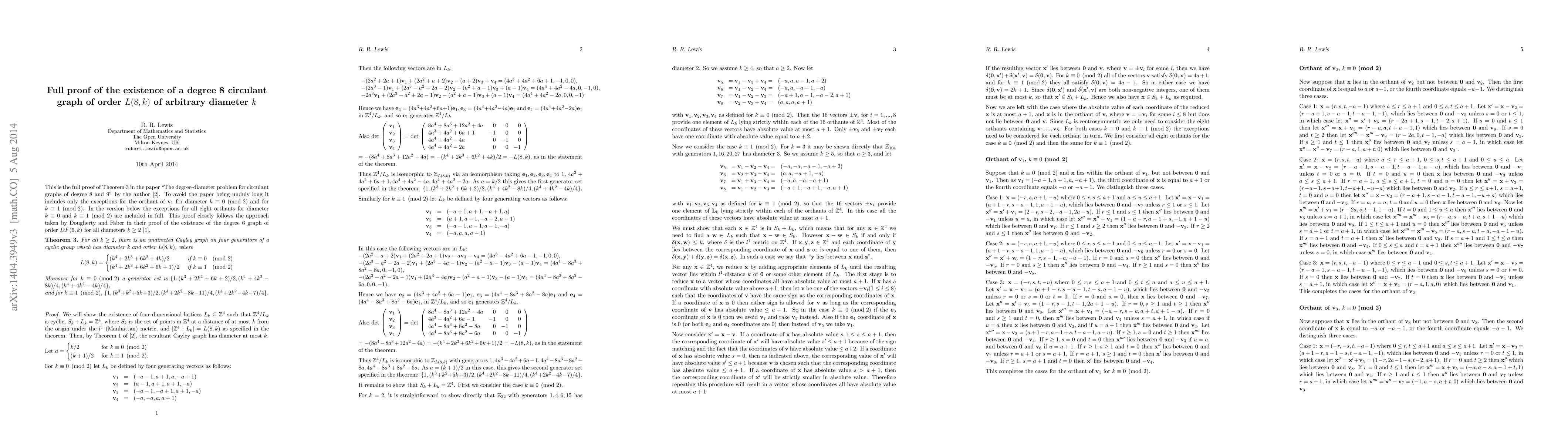 This is the full proof of Theorem 3 on the existence of the largest known degree 8 circulant graph for all diameters stated in the paper "The degree-diameter problem for circulant graphs of degree 8 and 9" by the author. To avoid the paper being unduly long the exceptions for only one case were included in the statement of the proof. In the statement of the proof presented in this paper the exceptions for all cases are included in full. This proof closely follows the approach taken by Dougherty and Faber for the existence of the largest known degree 6 circulant graph for all diameters.