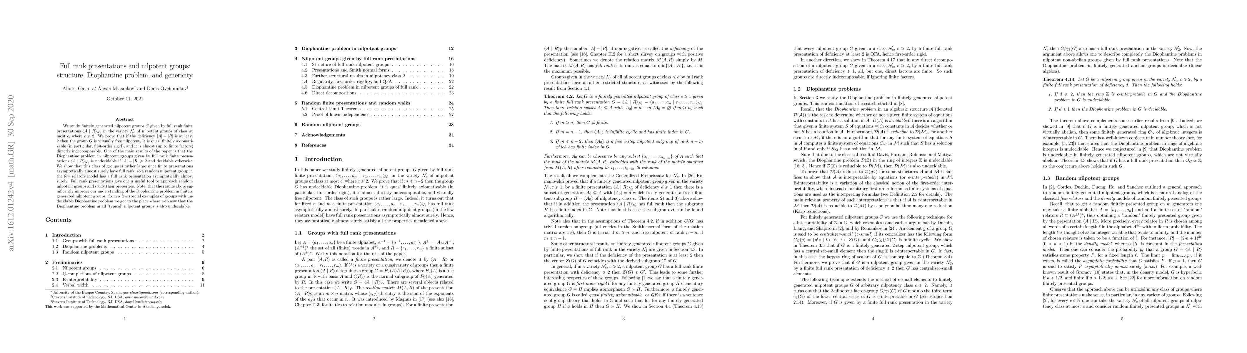 This paper explores finitely generated nilpotent groups defined by full rank presentations, proving that such groups are virtually free nilpotent and exhibit quasi finitely axiomatizability. It concludes that the Diophantine problem for these groups is undecidable when the deficiency is at least 2, while being decidable otherwise, and highlights that full rank presentations are almost always found in random nilpotent groups.