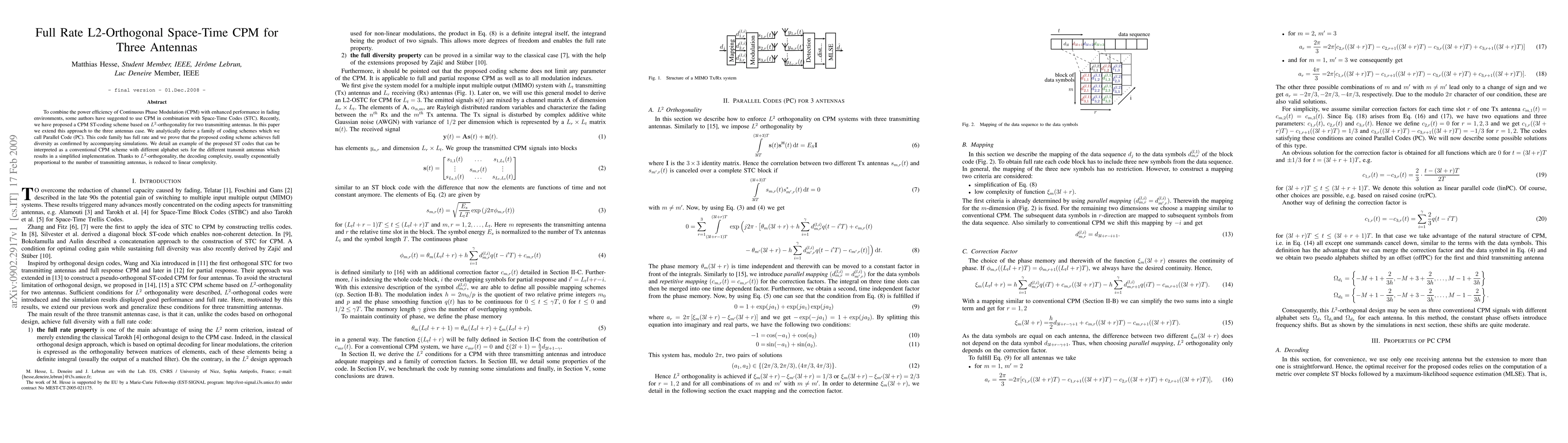 This paper extends a previously proposed L2-orthogonal Space-Time Continuous Phase Modulation (CPM) coding scheme to three transmitting antennas, introducing a full-rate Parallel Code (PC) family. The authors demonstrate that the proposed scheme achieves full diversity and reduced decoding complexity, simplifying implementation.