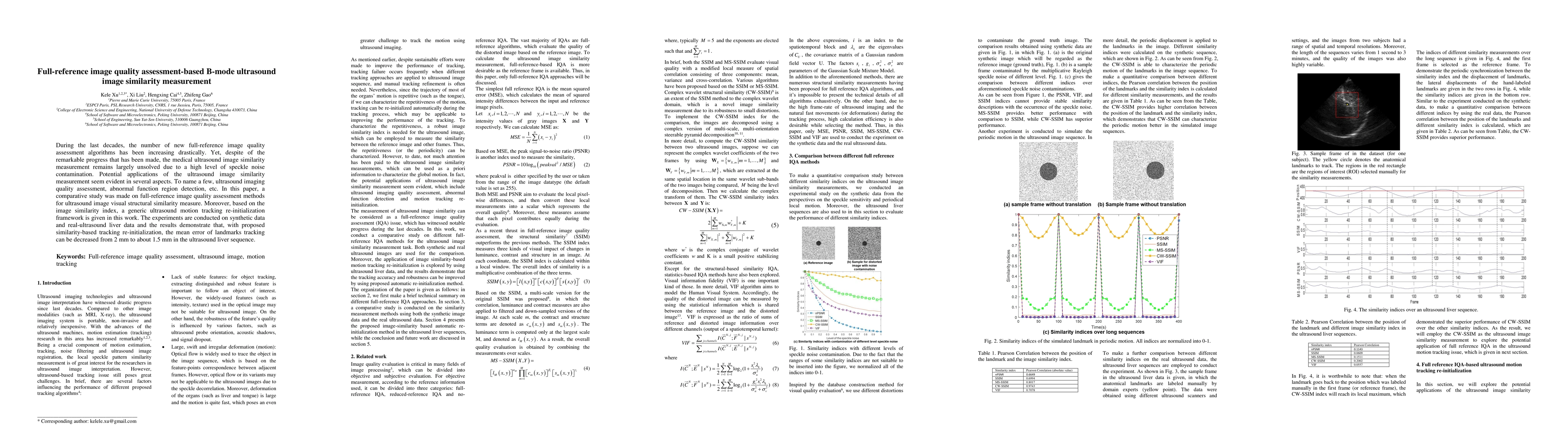 During the last decades, the number of new full-reference image quality assessment algorithms has been increasing drastically. Yet, despite of the remarkable progress that has been made, the medical ultrasound image similarity measurement remains largely unsolved due to a high level of speckle noise contamination. Potential applications of the ultrasound image similarity measurement seem evident in several aspects. To name a few, ultrasound imaging quality assessment, abnormal function region detection, etc. In this paper, a comparative study was made on full-reference image quality assessment methods for ultrasound image visual structural similarity measure. Moreover, based on the image similarity index, a generic ultrasound motion tracking re-initialization framework is given in this work. The experiments are conducted on synthetic data and real-ultrasound liver data and the results demonstrate that, with proposed similarity-based tracking re-initialization, the mean error of landmarks tracking can be decreased from 2 mm to about 1.5 mm in the ultrasound liver sequence.