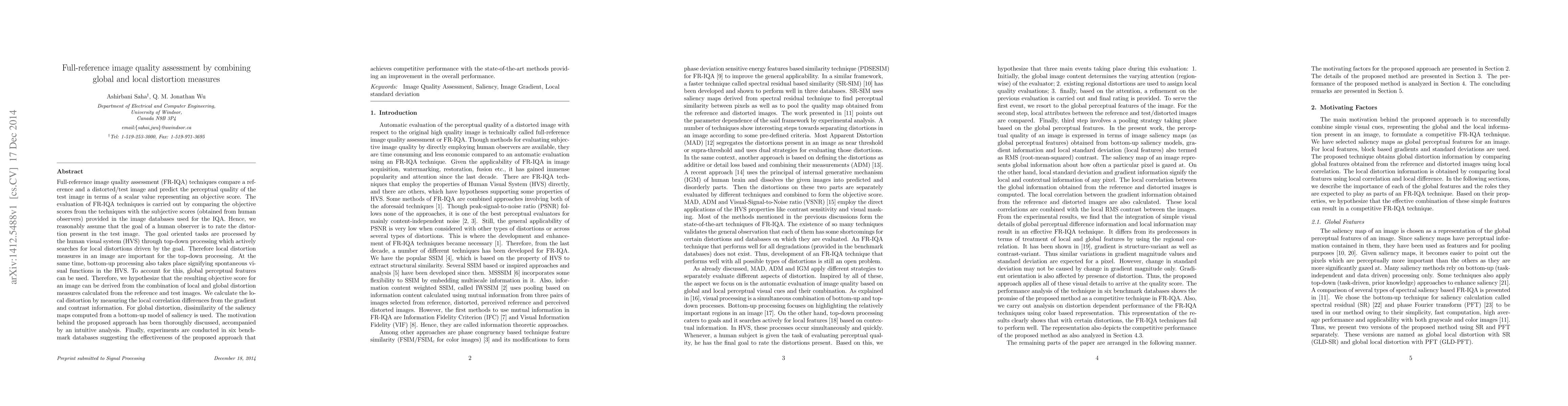 This paper proposes a full-reference image quality assessment technique that combines both local and global distortion measures to predict perceptual quality. The approach uses local correlation differences and global saliency map dissimilarity, and experiments show it achieves competitive performance with state-of-the-art methods.
