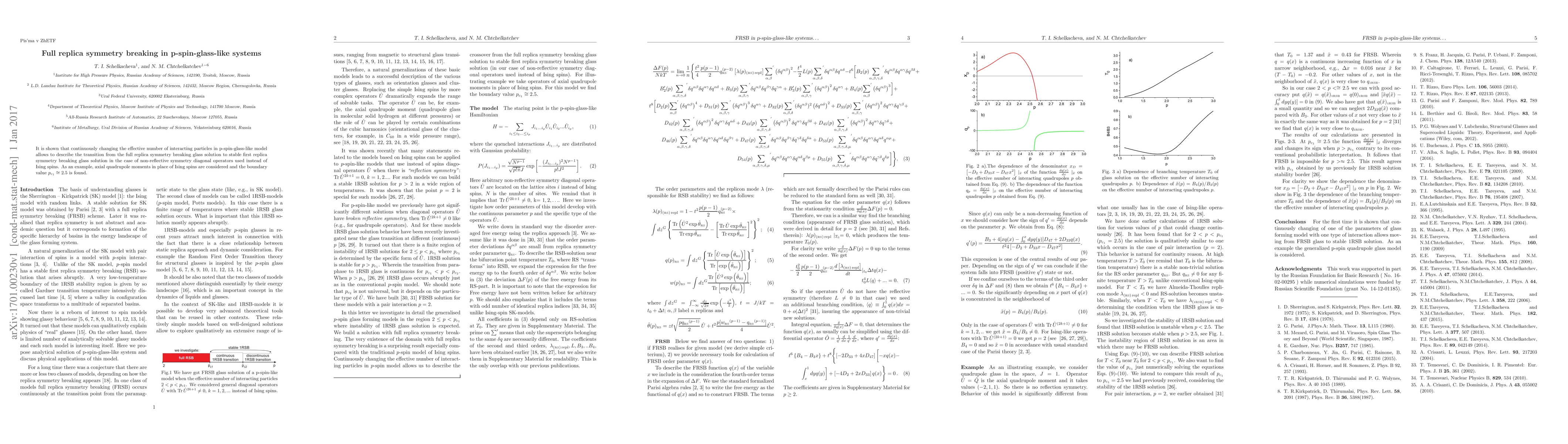 Summary: This study demonstrates how varying the effective number of particles in a p-spin-glass model transitions from full replica symmetry breaking to stable first replica symmetry breaking, using axial quadrupole moments instead of Ising spins, and identifies the critical boundary value $p_{c_{1}}\cong 2.5$.