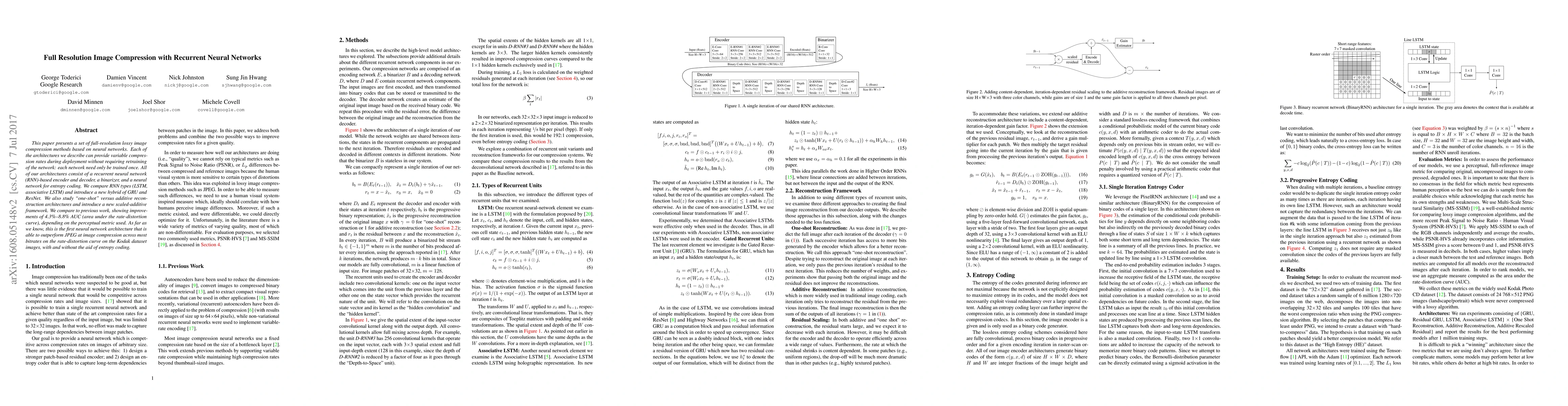 This paper presents a set of full-resolution lossy image compression methods based on neural networks. Each of the architectures we describe can provide variable compression rates during deployment without requiring retraining of the network: each network need only be trained once. All of our architectures consist of a recurrent neural network (RNN)-based encoder and decoder, a binarizer, and a neural network for entropy coding. We compare RNN types (LSTM, associative LSTM) and introduce a new hybrid of GRU and ResNet. We also study "one-shot" versus additive reconstruction architectures and introduce a new scaled-additive framework. We compare to previous work, showing improvements of 4.3%-8.8% AUC (area under the rate-distortion curve), depending on the perceptual metric used. As far as we know, this is the first neural network architecture that is able to outperform JPEG at image compression across most bitrates on the rate-distortion curve on the Kodak dataset images, with and without the aid of entropy coding.