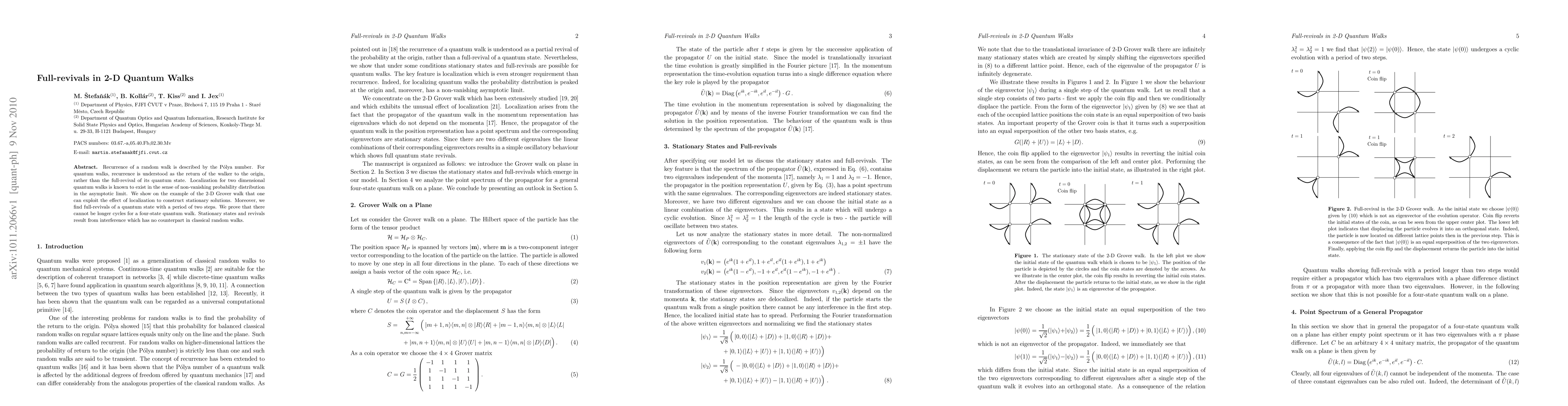 This paper investigates the recurrence phenomena in 2-D quantum walks, demonstrating that full-revivals of quantum states can occur with a period of two steps using the Grover walk. It proves that four-state quantum walks cannot exhibit longer cycles, highlighting the unique interference effects in quantum walks that differ from classical random walks.