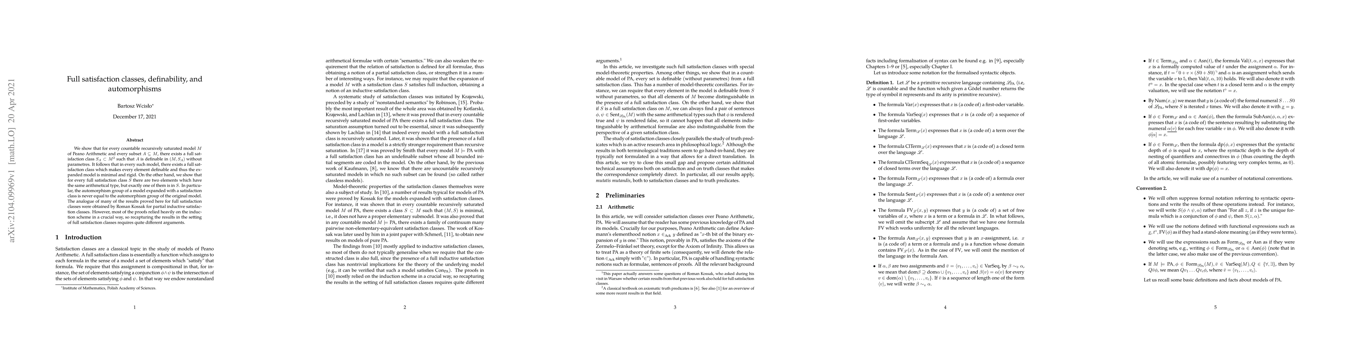 A research paper establishes that for countable recursively saturated models of Peano Arithmetic, every element can be defined using a full satisfaction class without parameters, leading to the expansion of models being minimal and rigid. Additionally, it shows that full satisfaction classes always contain two elements with the same arithmetical type but only one in the class.