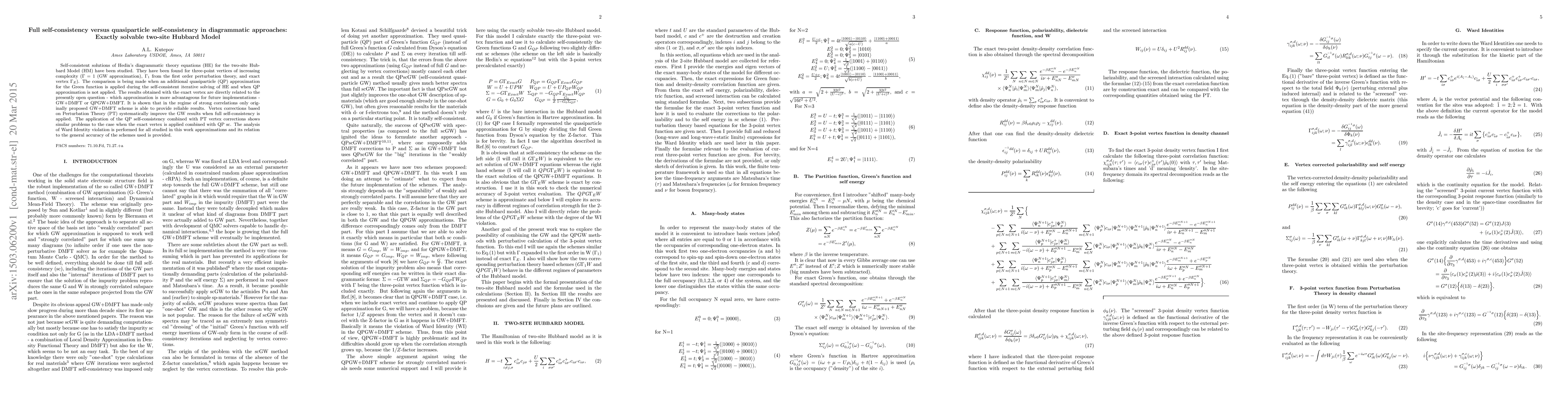 Self-consistent solutions of Hedin's diagrammatic theory equations (HE) for the two-site Hubbard Model (HM) have been studied. They have been found for three-point vertices of increasing complexity ($\Gamma=1$ (GW approximation), $\Gamma_{1}$ from the first order perturbation theory, and exact vertex $\Gamma_{E}$). The comparison is being made when an additional quasiparticle (QP) approximation for the Green function is applied during the self-consistent iterative solving of HE and when QP approximation is not applied. The results obtained with the exact vertex are directly related to the presently open question - which approximation is more advantageous for future implementations - GW+DMFT or QPGW+DMFT. It is shown that in the regime of strong correlations only originally proposed GW+DMFT scheme is able to provide reliable results. Vertex corrections based on Perturbation Theory (PT) systematically improve the GW results when full self-consistency is applied. The application of the QP self-consistency combined with PT vertex corrections shows similar problems to the case when the exact vertex is applied combined with QP sc. The analysis of Ward Identity violation is performed for all studied in this work approximations and its relation to the general accuracy of the schemes used is provided.