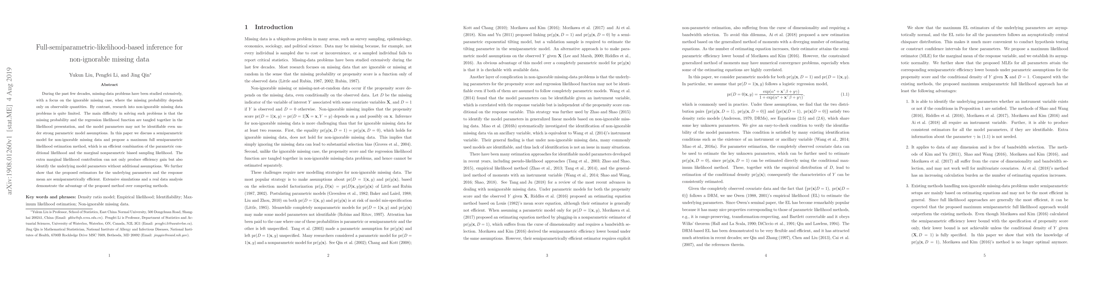 This paper proposes a semiparametric model and a maximum full semiparametric likelihood estimation method for non-ignorable missing data, combining parametric and nonparametric approaches to achieve efficiency and parameter identifiability without additional assumptions. The method is shown to outperform competing methods through simulations and real data analysis.