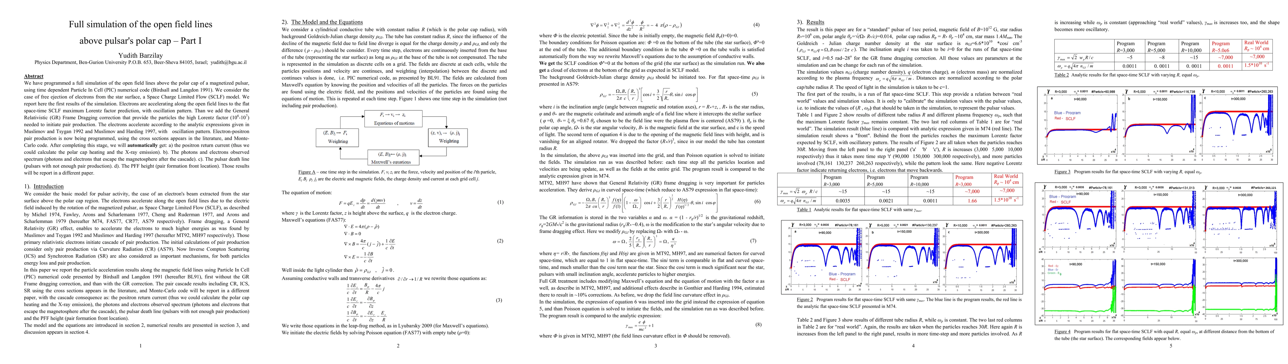 We have programmed a full simulation of the open field lines above the polar cap of a magnetized pulsar, using time dependent Particle In Cell (PIC) numerical code (Birdsall and Langdon 1991). We consider the case of free ejection of electrons from the star surface, a Space Charge Limited Flow (SCLF) model. We report here the first results of the simulation. Electrons are accelerating along the open field lines to the flat space-time SCLF maximum Lorentz factor prediction, with oscillation pattern. Than we add the General Relativistic Frame Dragging correction that provide the particles the high Lorentz factor (10^6 - 10^7) needed to initiate pair production. The electrons accelerate according to the analytic expressions given in Muslimov and Tsygan 1992, and Muslimov and Harding 1997, with oscillation pattern. Electron-positron pair production is now being programmed, using the cross sections appears in the literature, and Monte-Carlo code. After completing this stage, we will automatically get: a) the positron return current (thus we could calculate the polar cap heating and the X-ray emission). b). The photons and electrons observed spectrum (photons and electrons that escape the magnetosphere after the cascade). c). The pulsar death line (pulsars with not enough pair production). d). The PFF height (pair formation front location). Those results will be report in a different paper.