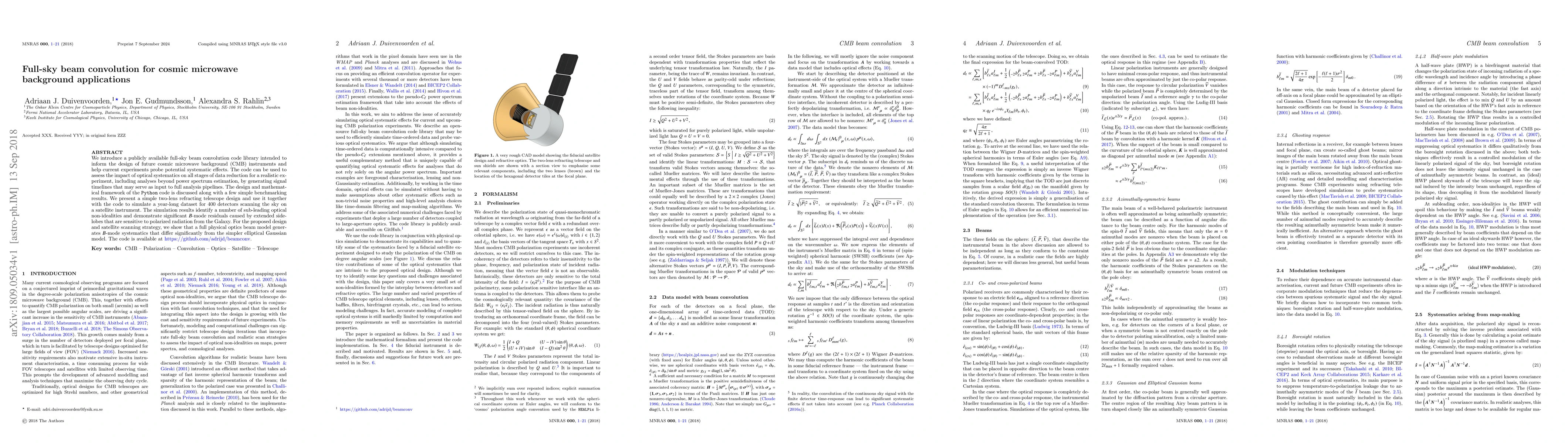 We introduce a publicly available full-sky beam convolution code library intended to inform the design of future cosmic microwave background (CMB) instruments and help current experiments probe potential systematic effects. The code can be used to assess the impact of optical systematics on all stages of data reduction for a realistic experiment, including analyses beyond power spectrum estimation, by generating signal timelines that may serve as input to full analysis pipelines. The design and mathematical framework of the Python code is discussed along with a few simple benchmarking results. We present a simple two-lens refracting telescope design and use it together with the code to simulate a year-long dataset for 400 detectors scanning the sky on a satellite instrument. The simulation results identify a number of sub-leading optical non-idealities and demonstrate significant B-mode residuals caused by extended sidelobes that are sensitive to polarized radiation from the Galaxy. For the proposed design and satellite scanning strategy, we show that a full physical optics beam model generates B-mode systematics that differ significantly from the simpler elliptical Gaussian model. The code is available at https://github.com/adrijd/beamconv