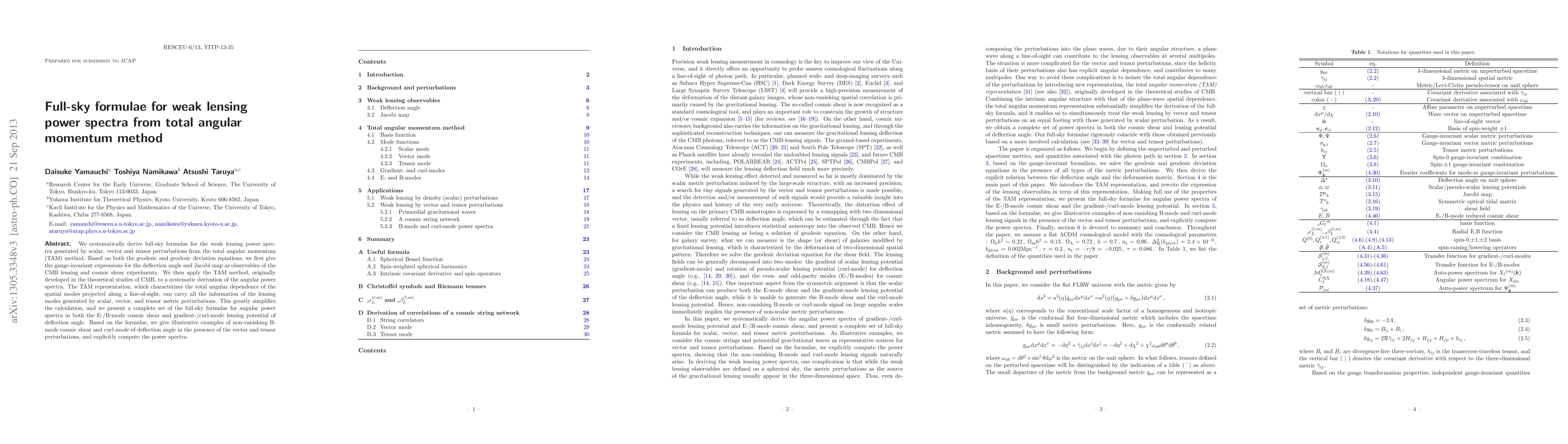 This paper derives full-sky formulae for weak lensing power spectra from scalar, vector, and tensor perturbations using the total angular momentum method. It simplifies the calculation by presenting gauge-invariant expressions for deflection angle and Jacobi map, and computes the power spectra for E-/B-mode cosmic shear and gradient-/curl-mode lensing potential.