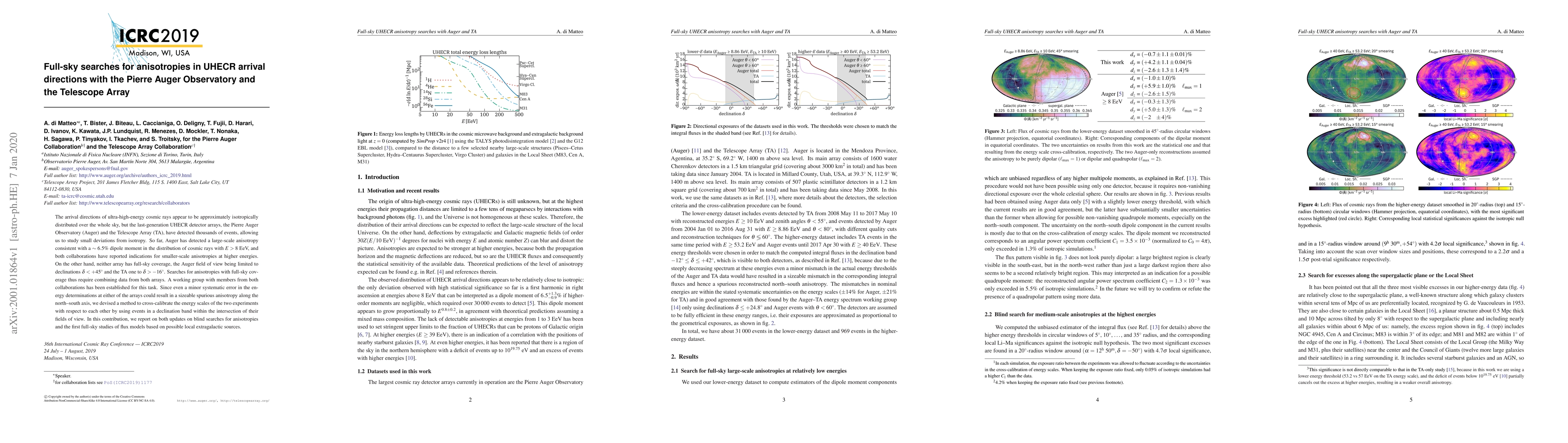 The arrival directions of ultra-high-energy cosmic rays appear to be approximately isotropically distributed over the whole sky, but the last-generation UHECR detector arrays, the Pierre Auger Observatory (Auger) and the Telescope Array (TA), have detected thousands of events, allowing us to study small deviations from isotropy. So far, Auger has detected a large-scale anisotropy consistent with a $\sim 6.5\%$ dipole moment in the distribution of cosmic rays with $E > 8$~EeV, and both collaborations have reported indications for smaller-scale anisotropies at higher energies. On the other hand, neither array has full-sky coverage, the Auger field of view being limited to declinations $\delta < +45^\circ$ and the TA one to $\delta > -16^\circ$. Searches for anisotropies with full-sky coverage thus require combining data from both arrays. A working group with members from both collaborations has been established for this task. Since even a minor systematic error in the energy determinations at either of the arrays could result in a sizeable spurious anisotropy along the north--south axis, we devised a method to cross-calibrate the energy scales of the two experiments with respect to each other by using events in a declination band within the intersection of their fields of view. In this contribution, we report on both updates on blind searches for anisotropies and the first full-sky studies of flux models based on possible local extragalactic sources.