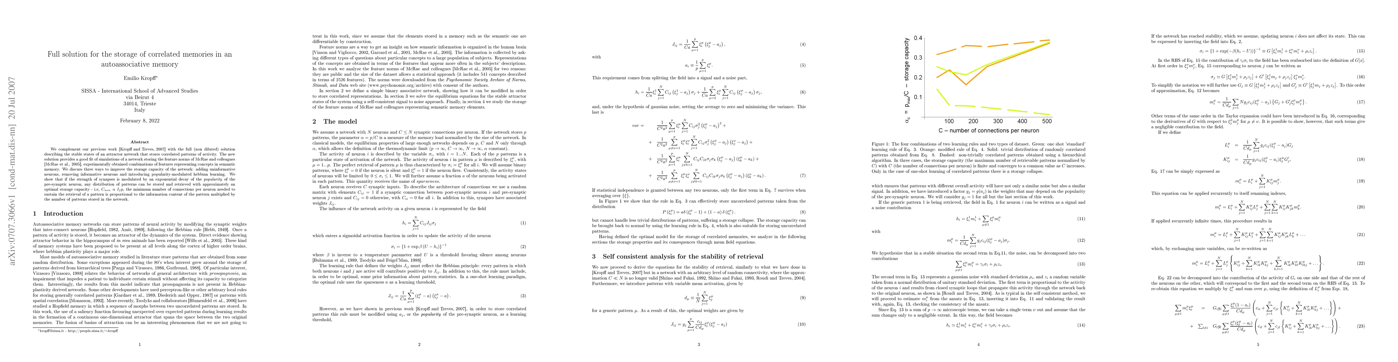 We complement our previous work [arxiv: 0707.0565] with the full (non diluted) solution describing the stable states of an attractor network that stores correlated patterns of activity. The new solution provides a good fit of simulations of a network storing the feature norms of McRae and colleagues [McRae et al, 2005], experimentally obtained combinations of features representing concepts in semantic memory. We discuss three ways to improve the storage capacity of the network: adding uninformative neurons, removing informative neurons and introducing popularity-modulated hebbian learning. We show that if the strength of synapses is modulated by an exponential decay of the popularity of the pre-synaptic neuron, any distribution of patterns can be stored and retrieved with approximately an optimal storage capacity - i.e, C ~ I.p, the minimum number of connections per neuron needed to sustain the retrieval of a pattern is proportional to the information content of the pattern multiplied by the number of patterns stored in the network.