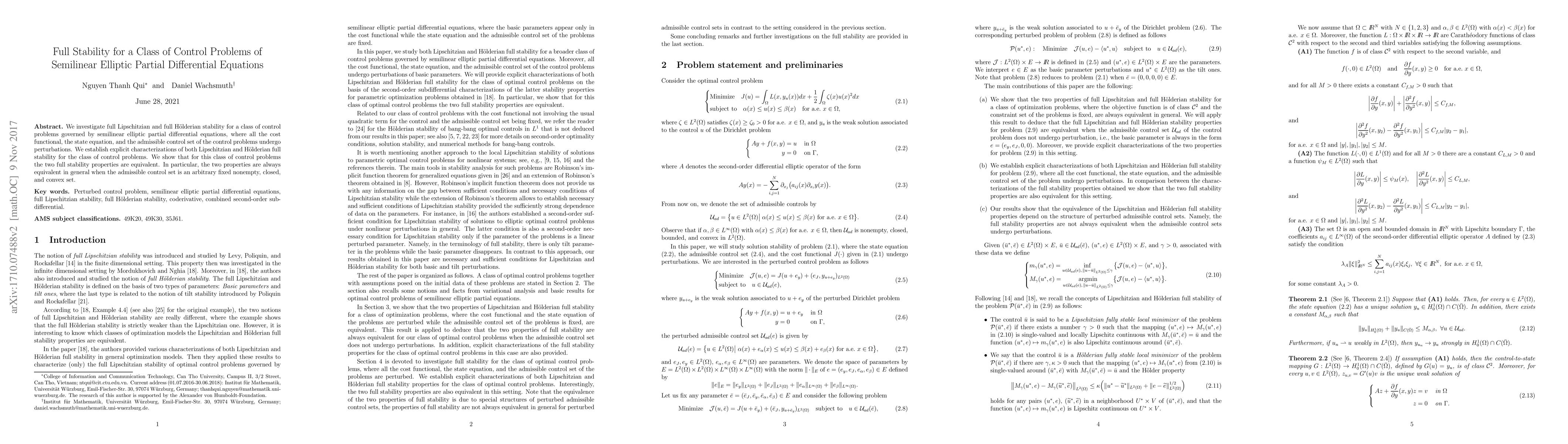 We investigate full Lipschitzian and full H\"olderian stability for a class of control problems governed by semilinear elliptic partial differential equations, where all the cost functional, the state equation, and the admissible control set of the control problems undergo perturbations. We establish explicit characterizations of both Lipschitzian and H\"olderian full stability for the class of control problems. We show that for this class of control problems the two full stability properties are equivalent. In particular, the two properties are always equivalent in general when the admissible control set is an arbitrary fixed nonempty, closed, and convex set.