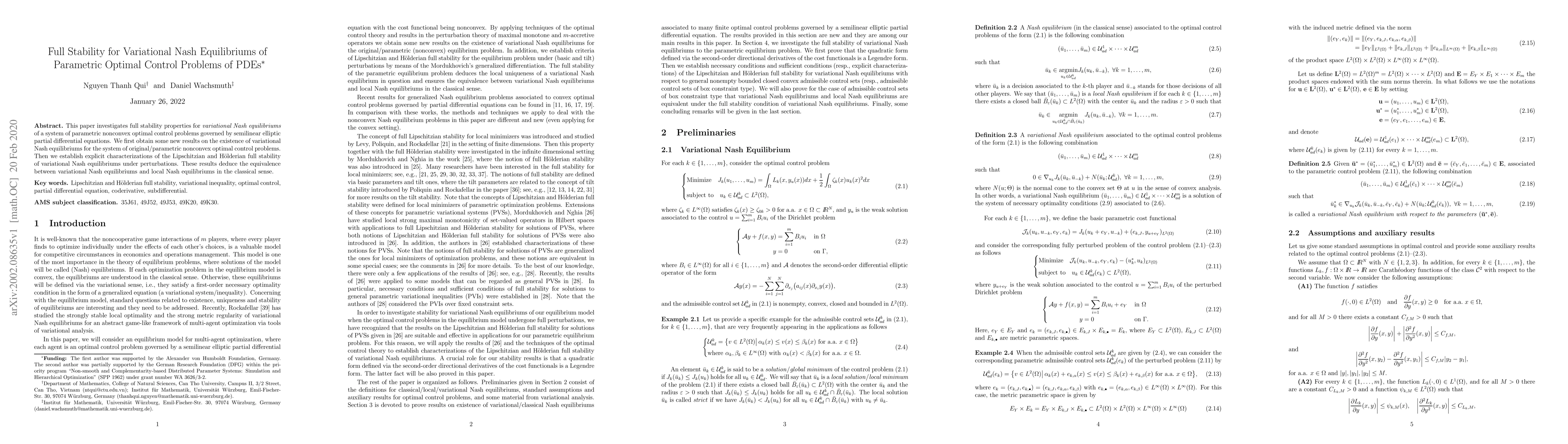 This paper establishes the existence of variational Nash equilibriums for parametric nonconvex optimal control problems governed by PDEs and characterizes their Lipschitzian and H\"olderian full stability under perturbations, demonstrating equivalence with classical local Nash equilibriums.