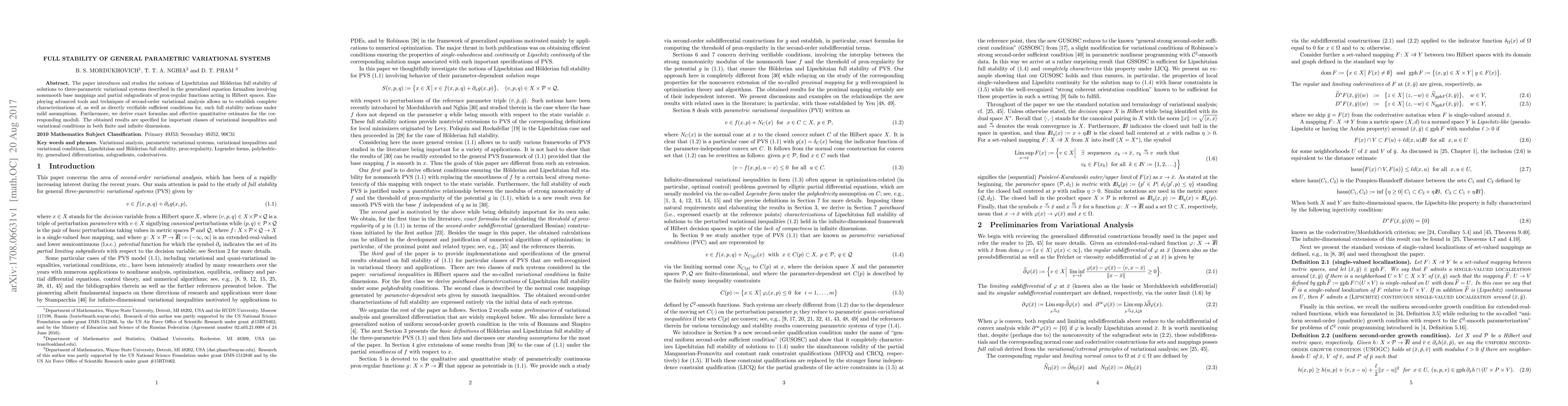 The paper establishes Lipschitzian and H\"olderian full stability for solutions of three-parametric variational systems, characterized through advanced variational analysis. It provides exact formulas and quantitative estimates for stability moduli under mild assumptions, applicable to various classes of variational inequalities.