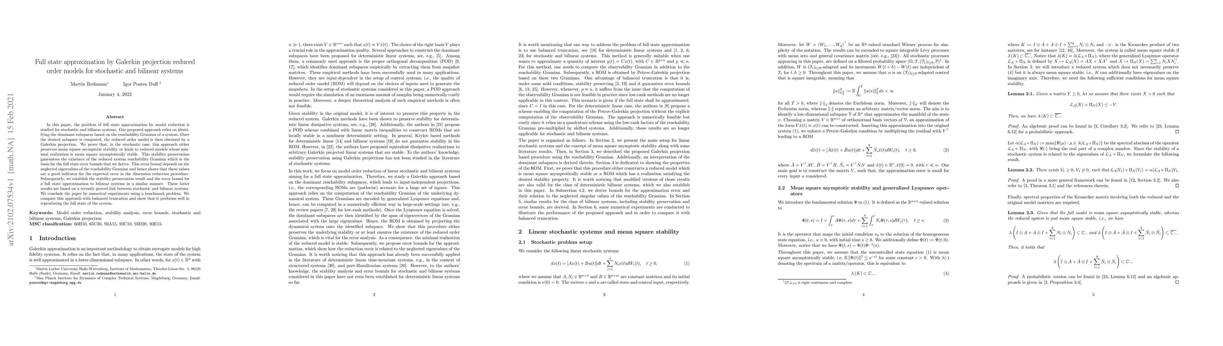 This paper proposes a method to approximate full states of stochastic and bilinear systems using Galerkin projection reduced order models, showing that the approach preserves stability and provides error bounds.
