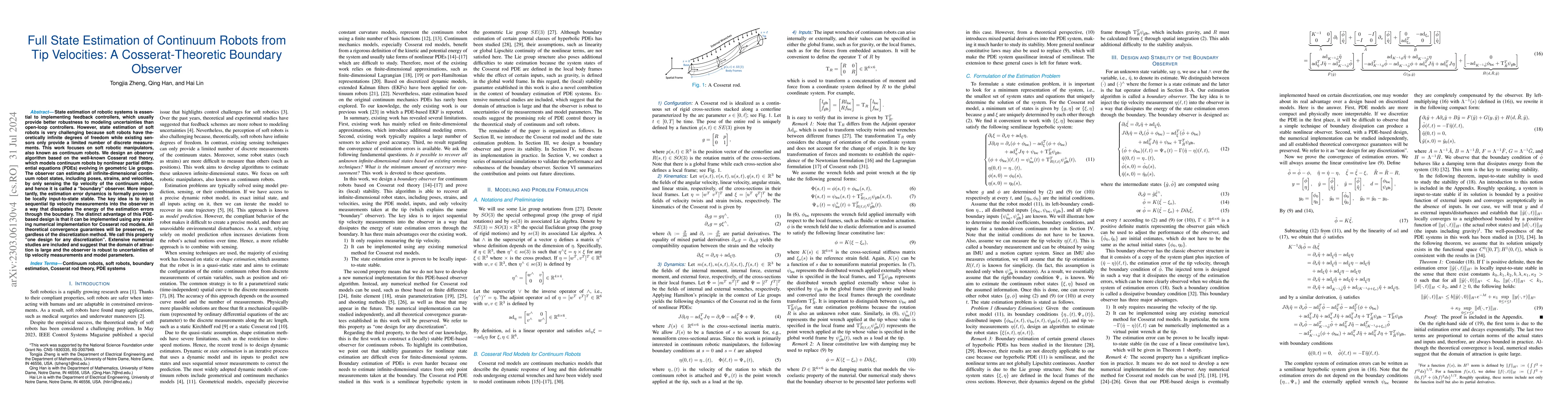 This paper presents a Cosserat-theoretic boundary observer for estimating the full state of continuum robots using only tip velocity measurements. The observer is proven to be locally input-to-state stable, effectively dissipating estimation errors through the boundary, and can be implemented by modifying boundary conditions in existing numerical solvers.