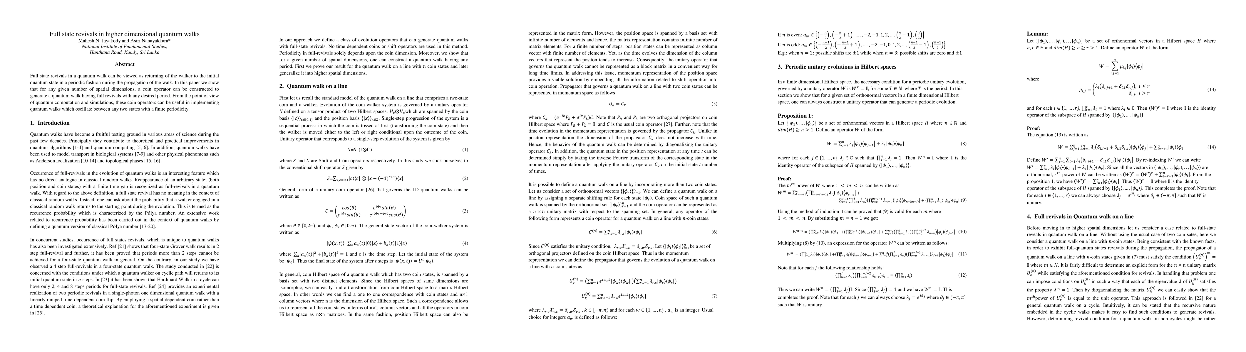 This paper demonstrates the construction of coin operators for quantum walks in any spatial dimension that enable full state revivals at any desired periodic interval, which can enhance quantum computation and simulation by oscillating between states with finite periodicity.