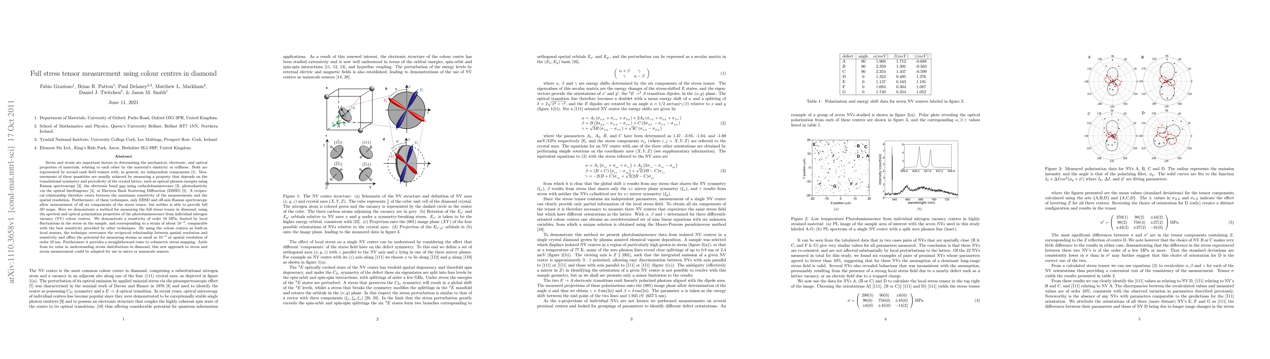 This paper presents a novel method for measuring the full stress tensor in diamond using the photoluminescence properties of nitrogen vacancy colour centres, achieving high sensitivity and spatial resolution, and enabling volumetric stress mapping. This technique overcomes limitations in existing methods, offering potential for applications in micro or nanoscale sensors.
