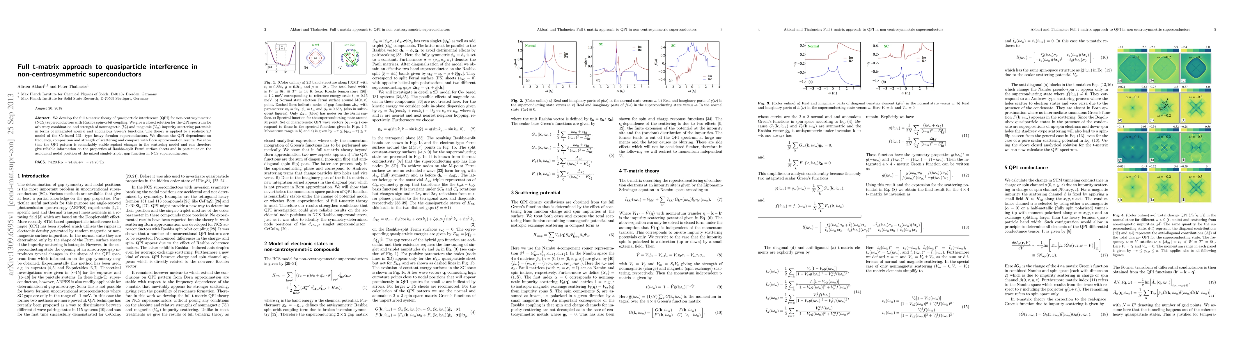 This paper develops a full t-matrix theory for quasiparticle interference in non-centrosymmetric superconductors with Rashba spin-orbit coupling, providing a closed solution for the QPI spectrum under various impurity scattering conditions. The theory is applied to Ce-based heavy fermion superconductors, demonstrating the stability of QPI patterns and their utility in revealing properties of the Fermi surface and gap function.
