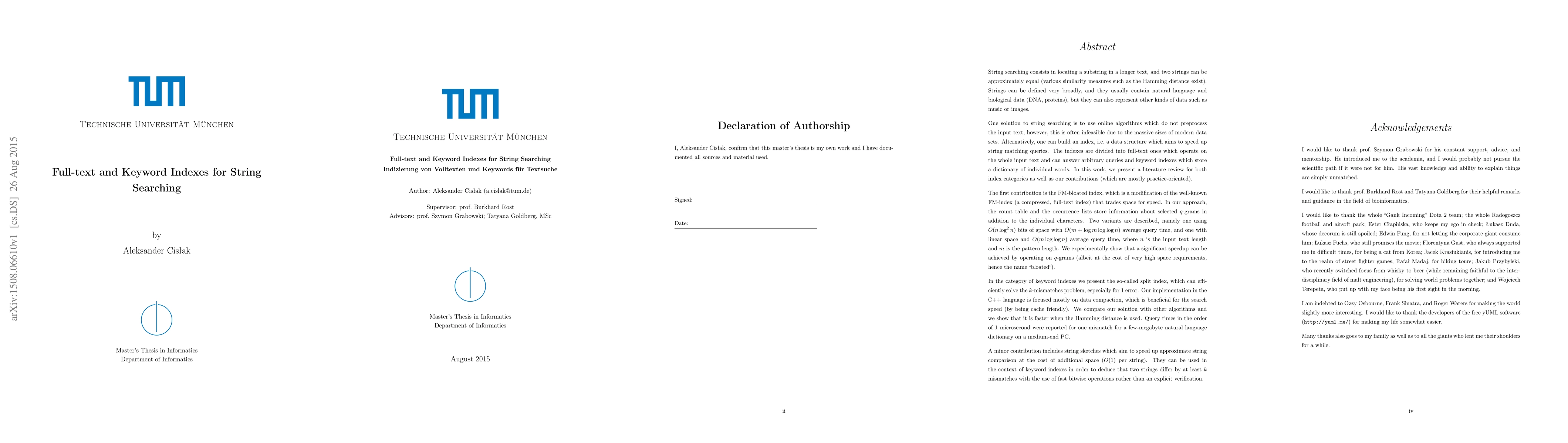 This paper reviews full-text and keyword indexes for string searching, introducing the FM-bloated index that modifies the FM-index to trade space for speed. It also presents the split index for efficient $k$-mismatches problem solving, achieving microsecond query times for one mismatch. Additionally, it proposes string sketches to speed up approximate string comparison using fast bitwise operations.