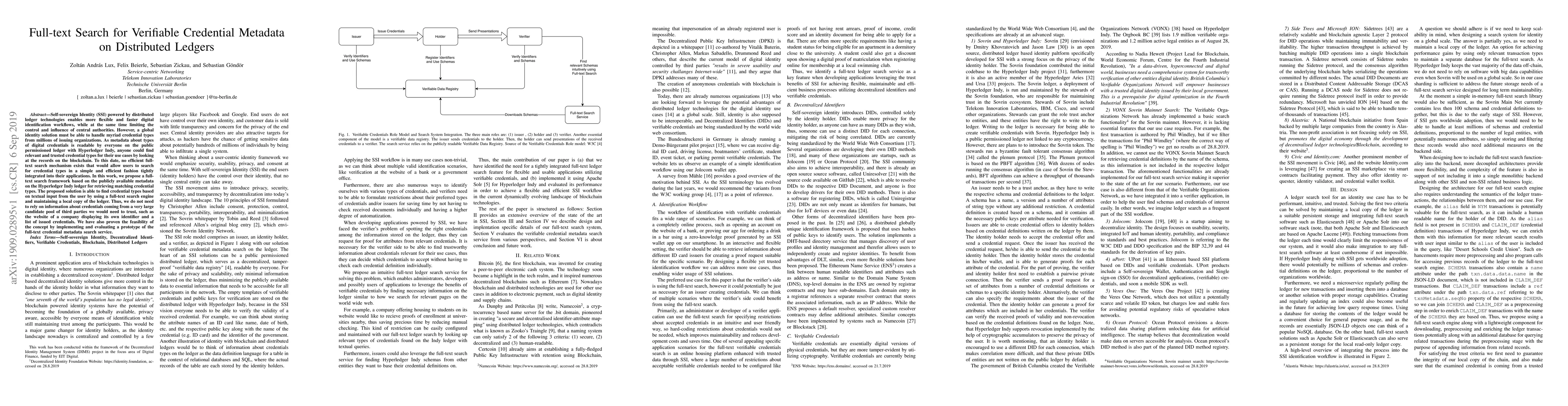 Self-sovereign Identity (SSI) powered by distributed ledger technologies enables more flexible and faster digital identification workflows, while at the same time limiting the control and influence of central authorities. However, a global identity solution must be able to handle myriad credential types from millions of issuing organizations. As metadata about types of digital credentials is readable by everyone on the public permissioned ledger with Hyperledger Indy, anyone could find relevant and trusted credential types for their use cases by looking at the records on the blockchain. To this date, no efficient full-text search mechanism exists that would allow users to search for credential types in a simple and efficient fashion tightly integrated into their applications. In this work, we propose a full-text search framework based on the publicly available metadata on the Hyperledger Indy ledger for retrieving matching credential types. The proposed solution is able to find credential types based on textual input from the user by using a full-text search engine and maintaining a local copy of the ledger. Thus, we do not need to rely on information about credentials coming from a very large candidate pool of third parties we would need to trust, such as the website of a company displaying its own identifier and a list of issued credentials. We have also proven the feasiblity of the concept by implementing and evaluating a prototype of the full-text credential metadata search service.