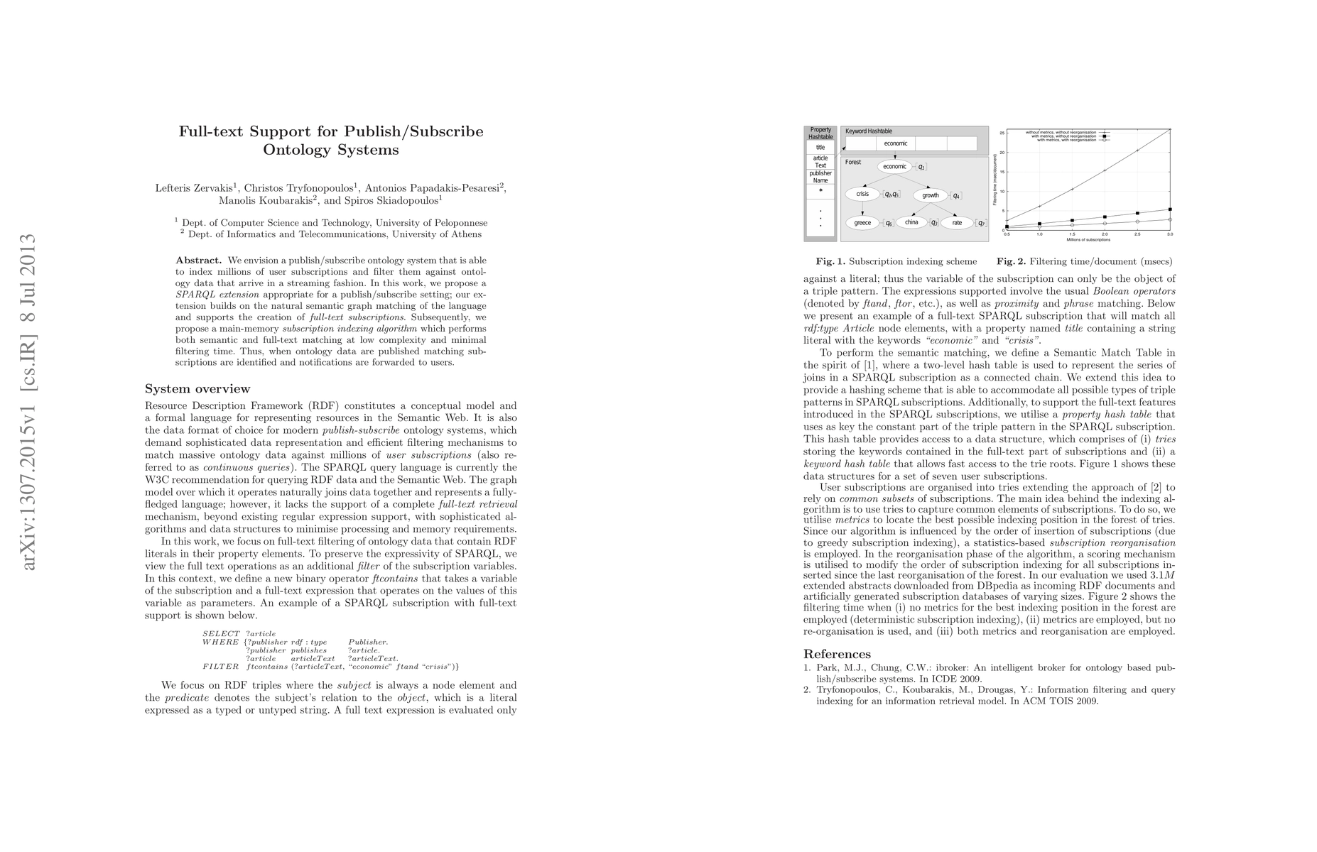 This paper proposes a SPARQL extension for a publish/subscribe ontology system that supports full-text subscriptions and introduces a main-memory indexing algorithm for efficient semantic and full-text matching, ensuring low complexity and minimal filtering time for real-time notifications.