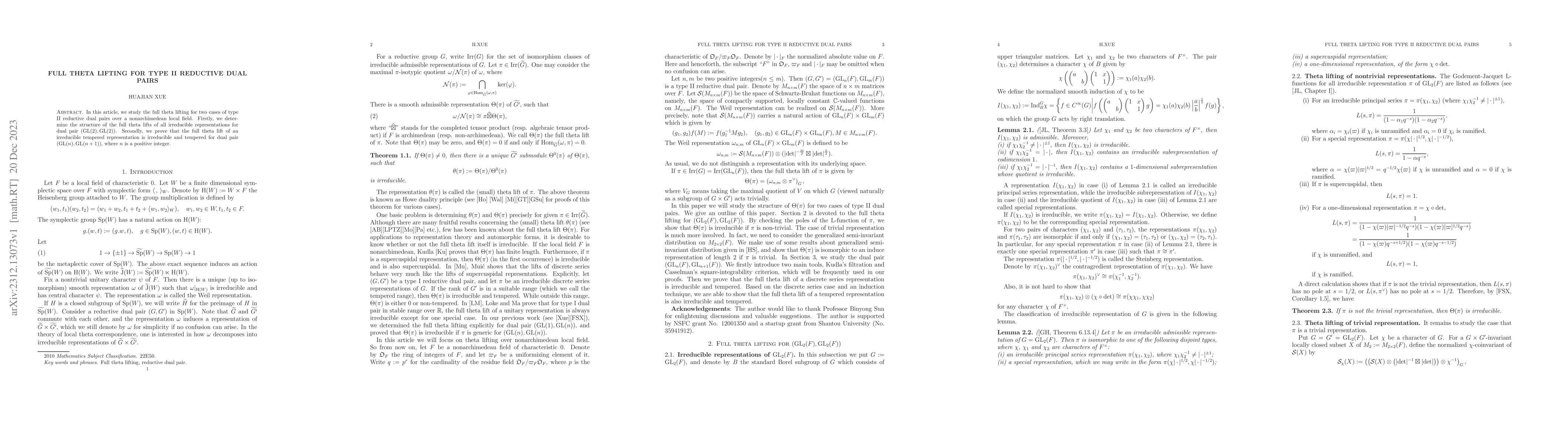 This paper investigates full theta lifting for type II reductive dual pairs over nonarchimedean local fields, determining the structure of theta lifts for $(\mathrm{GL}(2),\mathrm{GL}(2))$ and proving irreducibility and temperance for $(\mathrm{GL}(n),\mathrm{GL}(n+1))$ lifts.