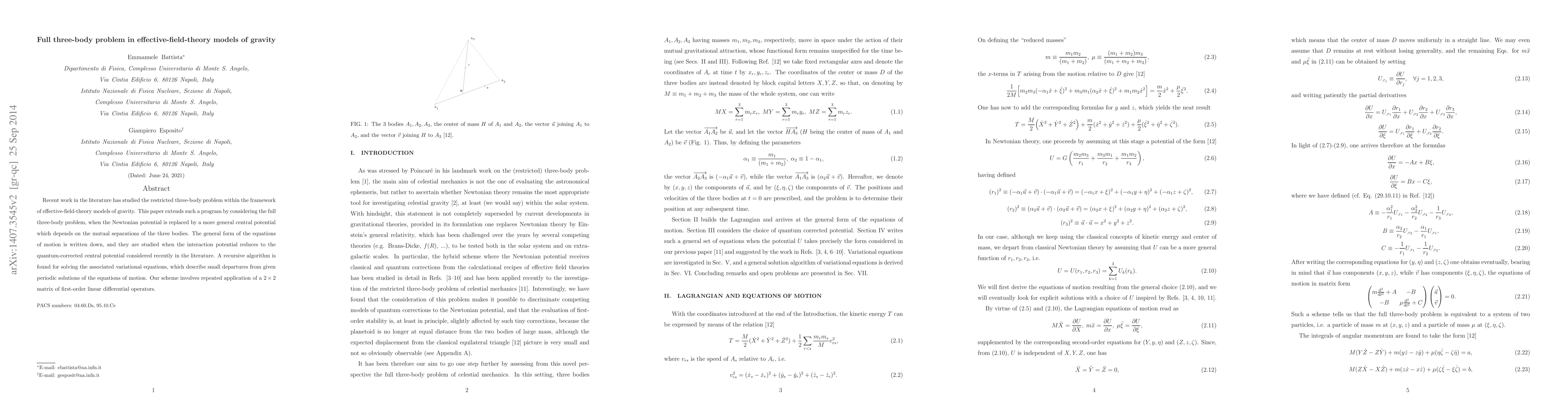 This paper solves the full three-body problem in effective-field-theory models of gravity by finding a recursive algorithm to study small departures from periodic solutions, extending previous work on the restricted case.