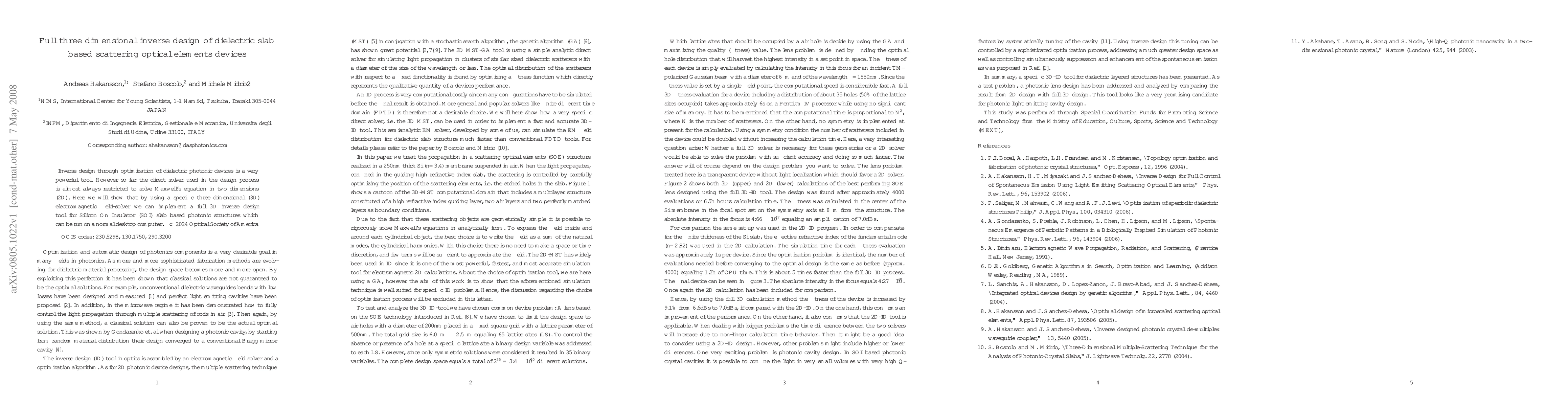 This paper presents a novel 3D inverse design method for optimizing dielectric slab-based scattering optical elements using a full 3D electromagnetic field solver, enabling the design of Silicon On Insulator photonic structures on standard desktop computers. This approach overcomes the limitations of previous 2D design methods.