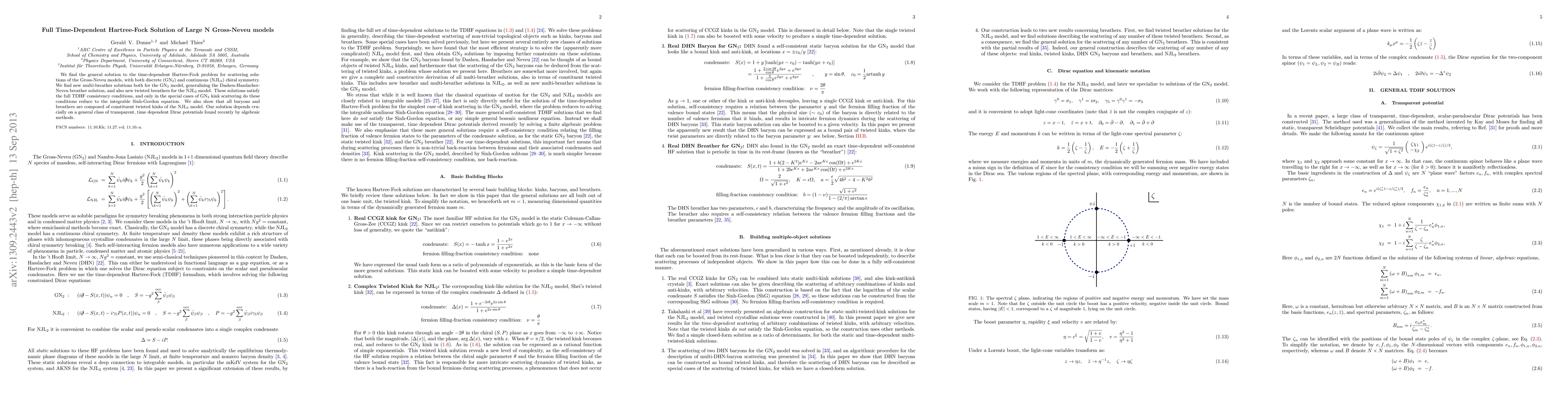This paper presents the full time-dependent Hartree-Fock solution for the Gross-Neveu models, discovering new multi-breather and twisted breather solutions that satisfy TDHF conditions. It also reveals that baryons and breathers in the NJL_2 model are made of constituent twisted kinks, relying on recent transparent time-dependent Dirac potentials.