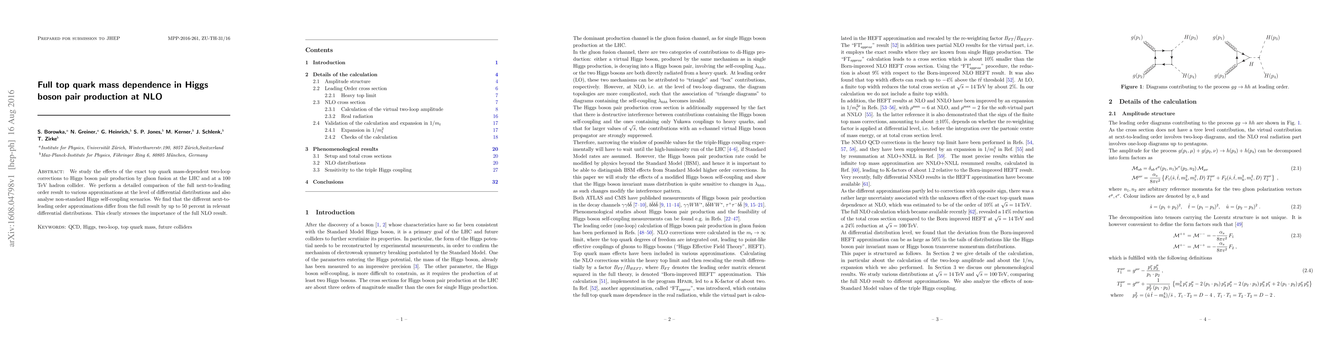 This research investigates the precise top-quark mass dependent two-loop corrections for Higgs boson pair production via gluon fusion at the LHC and a 100 TeV collider. The study finds that approximations can differ from the full next-to-leading order result by up to 50 percent in differential distributions, underscoring the necessity of the complete NLO analysis.