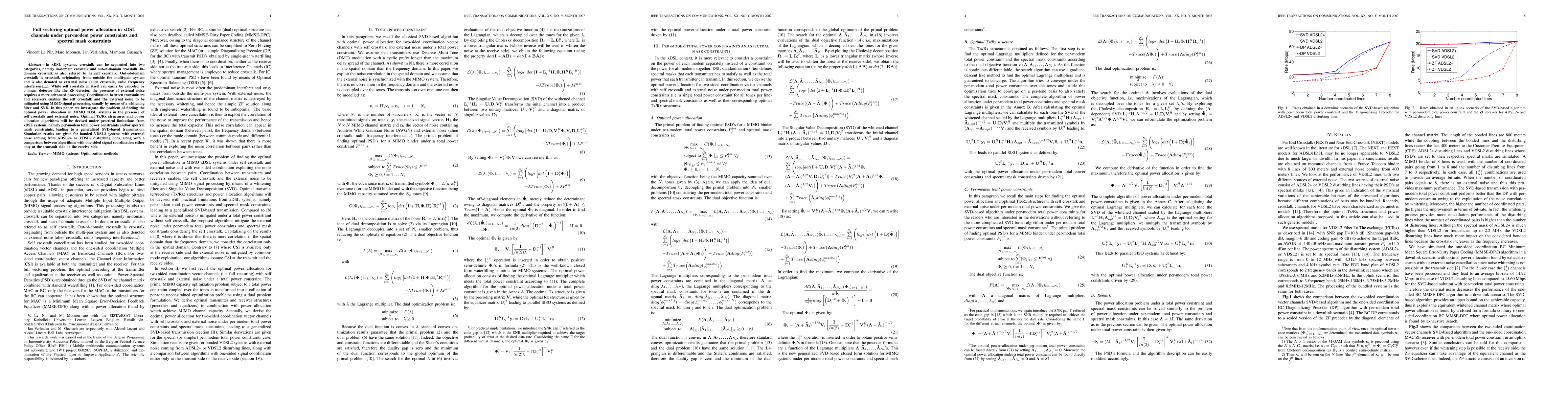 This paper explores optimal power allocation for MIMO xDSL systems to mitigate self crosstalk and external noise, devising algorithms under per-modem power and spectral mask constraints. Simulation results for VDSL2 systems show the effectiveness of generalized SVD-based transmission compared to one-sided signal coordination.