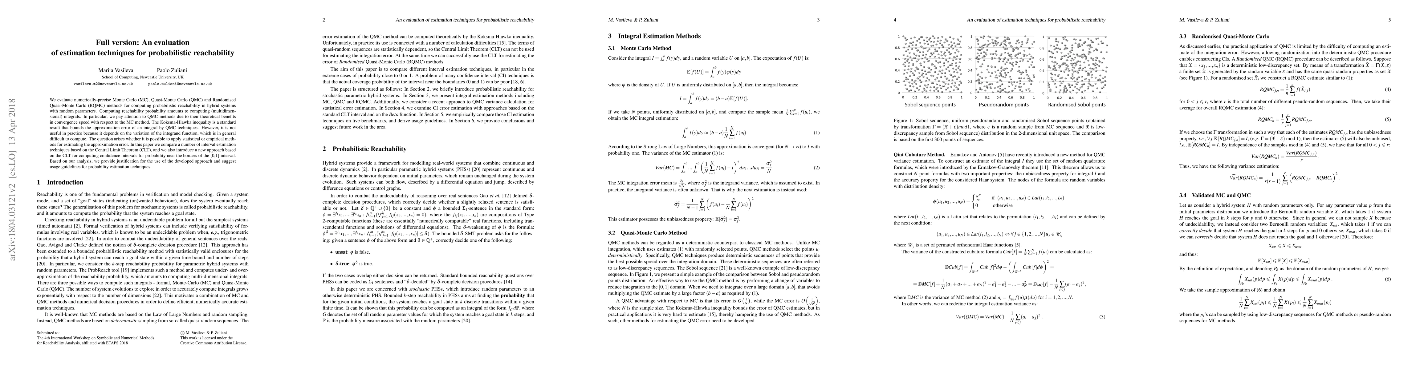 We evaluate numerically-precise Monte Carlo (MC), Quasi-Monte Carlo (QMC) and Randomised Quasi-Monte Carlo (RQMC) methods for computing probabilistic reachability in hybrid systems with random parameters. Computing reachability probability amounts to computing (multidimensional) integrals. In particular, we pay attention to QMC methods due to their theoretical benefits in convergence speed with respect to the MC method. The Koksma-Hlawka inequality is a standard result that bounds the approximation of an integral by QMC techniques. However, it is not useful in practice because it depends on the variation of the integrand function, which is in general difficult to compute. The question arises whether it is possible to apply statistical or empirical methods for estimating the approximation error. In this paper we compare a number of interval estimation techniques based on the Central Limit Theorem (CLT), and we also introduce a new approach based on the CLT for computing confidence intervals for probability near the borders of the [0,1] interval. Based on our analysis, we provide justification for the use of the developed approach and suggest usage guidelines for probability estimation techniques.