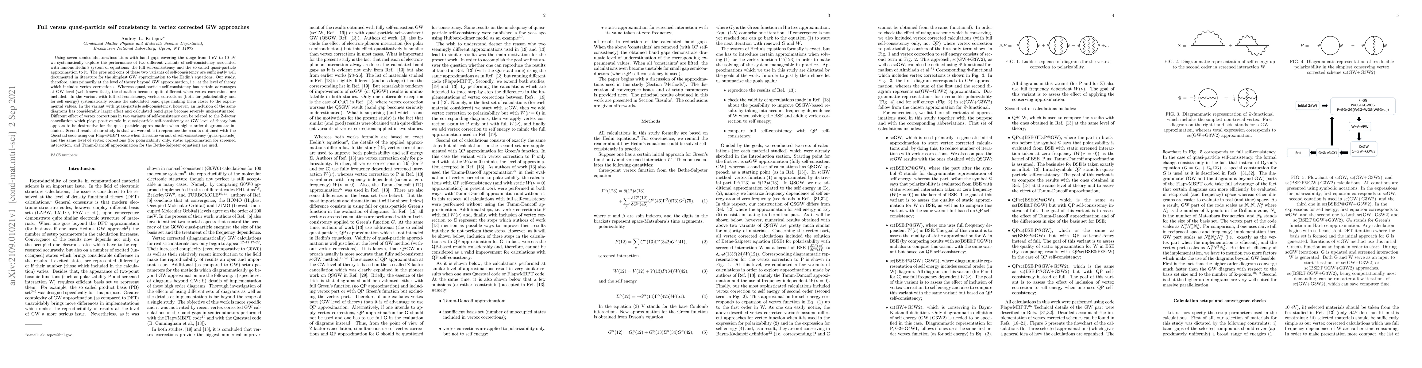 Using seven semiconductors/insulators with band gaps covering the range from 1 eV to 10 eV we systematically explore the performance of two different variants of self-consistency associated with famous Hedin's system of equations: the full self-consistency and the so called quasi-particle approximation to it. The pros and cons of these two variants of self-consistency are sufficiently well documented in literature for the simplest GW approximation to the Hedin's equations. Our study, therefore, aims primarily at the level of theory beyond GW approximation, i.e. at the level of theory which includes vertex corrections. Whereas quasi-particle self-consistency has certain advantages at GW level (well known fact), the situation becomes quite different when vertex corrections are included. In the variant with full self-consistency, vertex corrections (both for polarizability and for self energy) systematically reduce the calculated band gaps making them closer to the experimental values. In the variant with quasi-particle self-consistency, however, an inclusion of the same diagrams has considerably larger effect and calculated band gaps become severely underestimated. Different effect of vertex corrections in two variants of self-consistency can be related to the Z-factor cancellation which plays positive role in quasi-particle self-consistency at GW level of theory but appears to be destructive for the quasi-particle approximation when higher order diagrams are included. Second result of our study is that we were able to reproduce the results obtained with the Questaal code using our FlapwMBPT code when the same variant of self-consistency (quasi-particle) and the same level of vertex corrections (for polarizability only, static approximation for screened interaction, and Tamm-Dancoff approximation for the Bethe-Salpeter equation) are used.