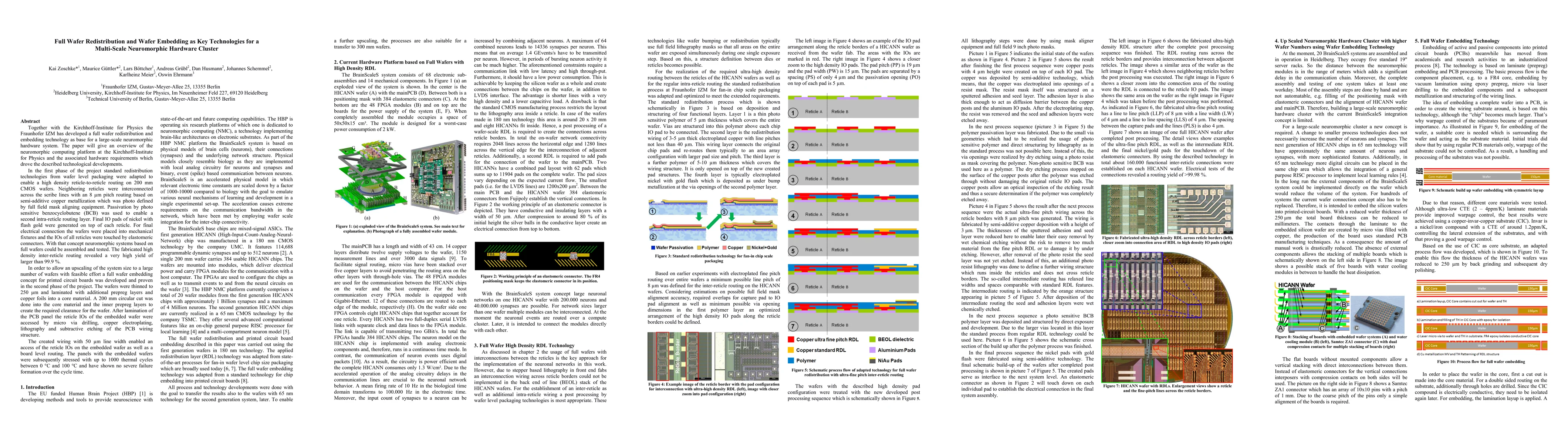 This paper details the development of full wafer redistribution and embedding technologies by Fraunhofer IZM and KIP for a large-scale neuromorphic hardware cluster. The project adapted standard wafer redistribution techniques to achieve high-density inter-reticle routing on 200mm CMOS wafers, followed by a full wafer embedding concept for printed circuit boards, demonstrating high yield and reliability over 1000 thermal cycles.
