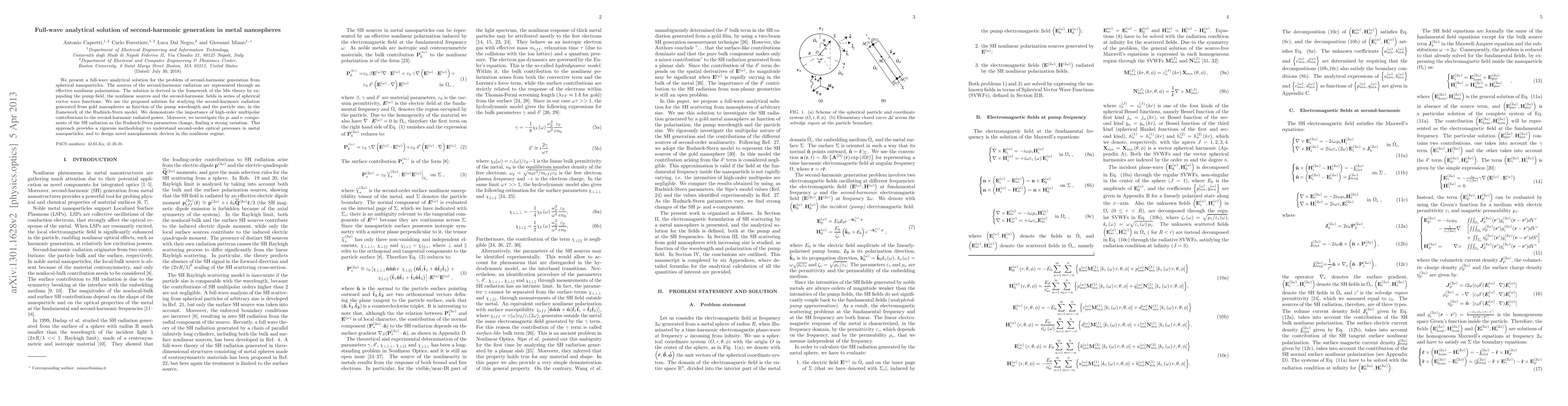 We present a full-wave analytical solution for the problem of second-harmonic generation from spherical nanoparticles. The sources of the second-harmonic radiation are represented through an effective nonlinear polarization. The solution is derived in the framework of the Mie theory by expanding the pump field, the nonlinear sources and the second-harmonic fields in series of spherical vector wave functions. We use the proposed solution for studying the second-harmonic radiation generated from gold nanospheres as function of the pump wavelength and the particle size, in the framework of the Rudnick-Stern model. We demonstrate the importance of high-order multipolar contributions to the second-harmonic radiated power. Moreover, we investigate the p- and s- components of the SH radiation as the Rudnick-Stern parameters change, finding a strong variation. This approach provides a rigorous methodology to understand second-order optical processes in metal nanoparticles, and to design novel nanoplasmonic devices in the nonlinear regime.