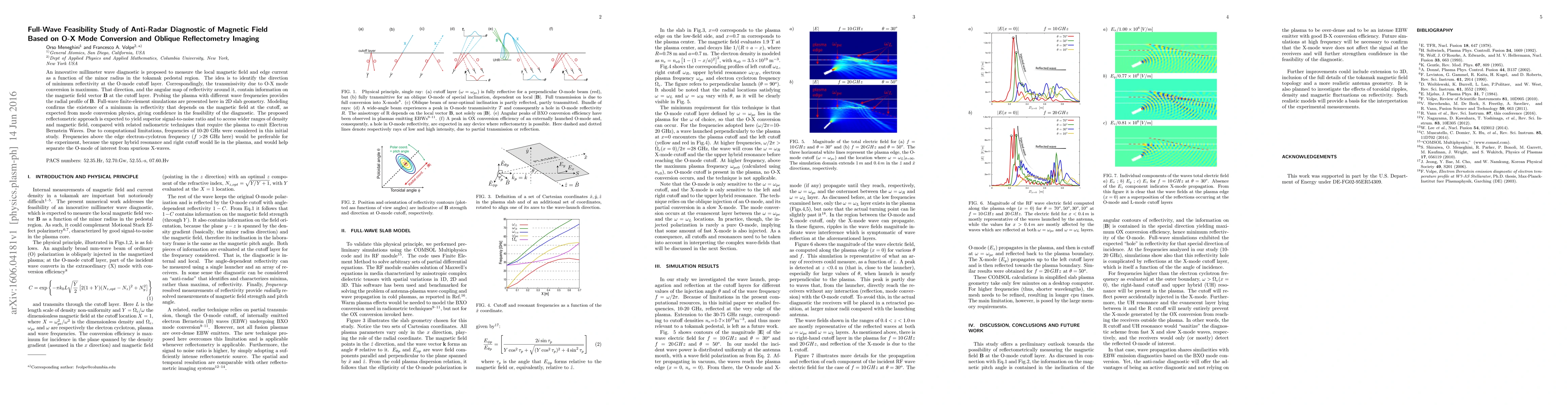 An innovative millimeter wave diagnostic is proposed to measure the local magnetic field and edge current as a function of the minor radius in the tokamak pedestal region. The idea is to identify the direction of minimum reflectivity at the O-mode cutoff layer. Correspondingly, the transmissivity due to O-X mode conversion is maximum. That direction, and the angular map of reflectivity around it, contain information on the magnetic field vector B at the cutoff layer. Probing the plasma with different wave frequencies provides the radial profile of B. Full-wave finite-element simulations are presented here in 2D slab geometry. Modeling confirms the existence of a minimum in reflectivity that depends on the magnetic field at the cutoff, as expected from mode conversion physics, giving confidence in the feasibility of the diagnostic. The proposed reflectometric approach is expected to yield superior signal-to-noise ratio and to access wider ranges of density and magnetic field, compared with related radiometric techniques that require the plasma to emit Electron Bernstein Waves. Due to computational limitations, frequencies of 10-20 GHz were considered in this initial study. Frequencies above the edge electron-cyclotron frequency (f>28 GHz here) would be preferable for the experiment, because the upper hybrid resonance and right cutoff would lie in the plasma, and would help separate the O-mode of interest from spurious X-waves.